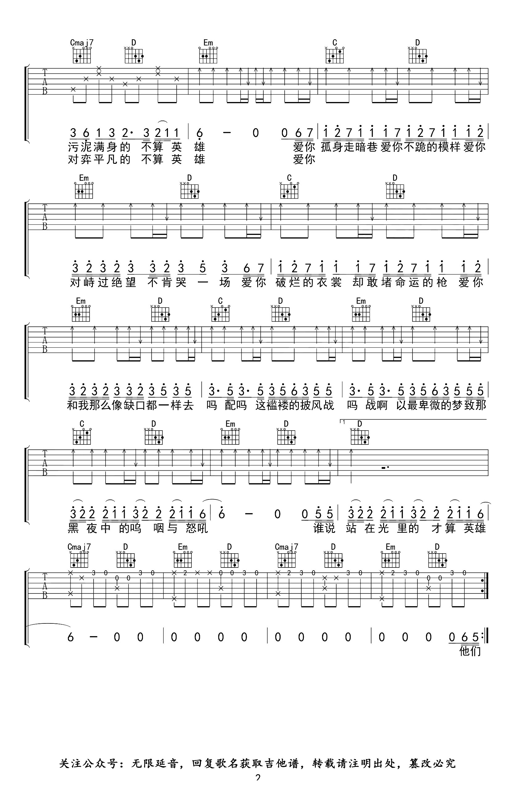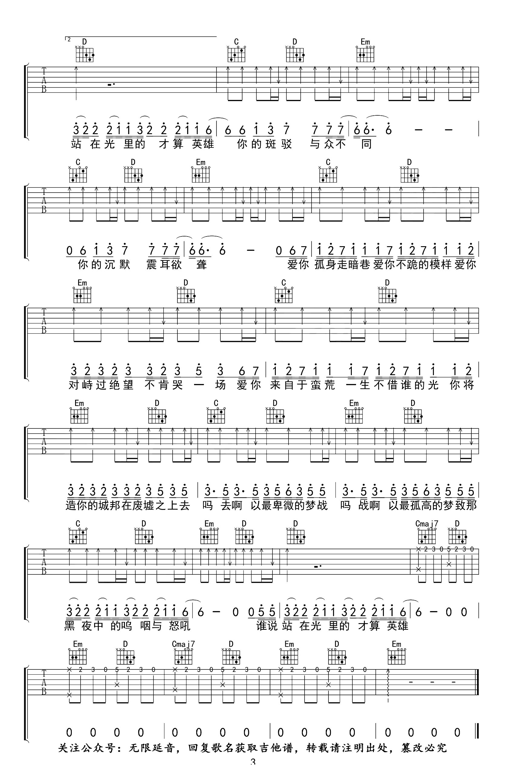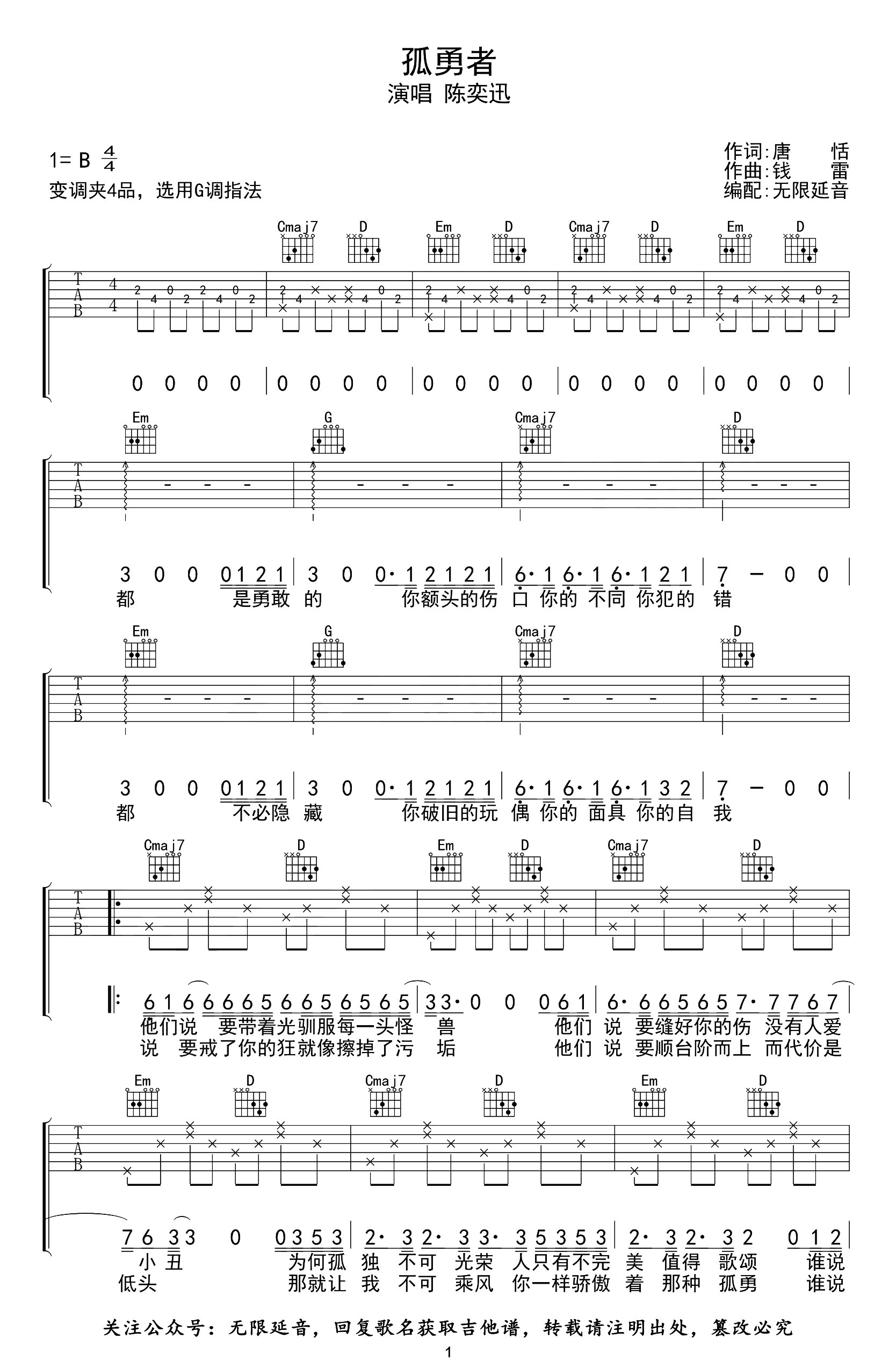 曲谱介绍: 孤勇者吉他谱,陈奕迅版,由无限延音制谱分享,共3张图片谱,原调是B调,选用G调指法,推荐变调夹夹4品弹唱原调,本谱按原版编配含前奏+间奏+尾奏,难度较简单。