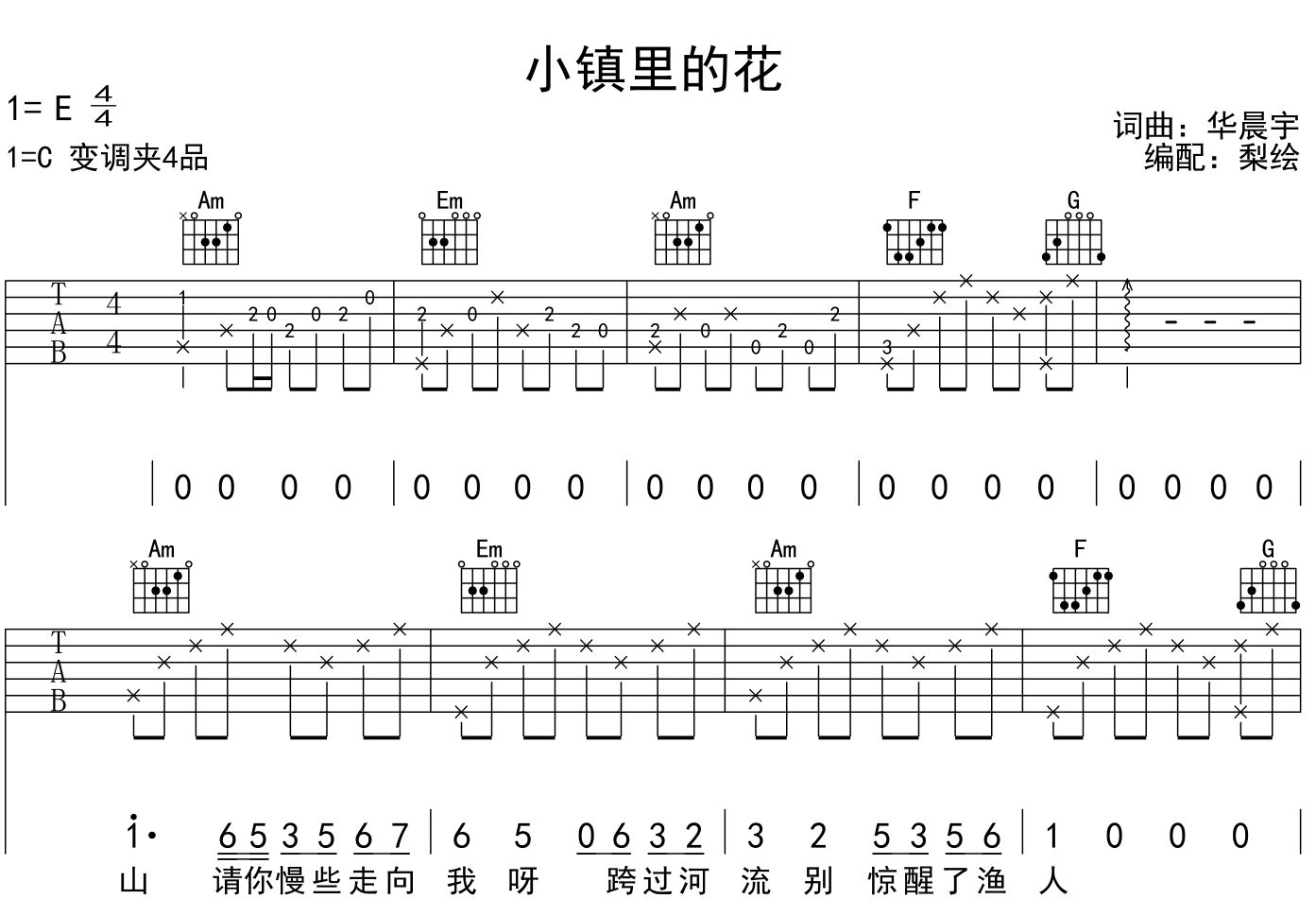 曲谱介绍: 小镇里的花吉他谱,由创作者梨绘制谱,共3张高清图片谱,原调E调,选用C调指法,变调夹夹4品弹唱原调,节奏4/4拍,包含前奏,弹唱难度简单。