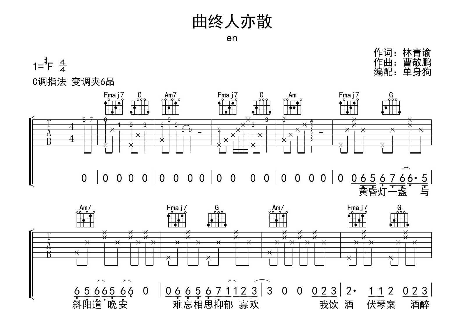 曲谱介绍: 曲终人亦散吉他谱,由创作者单身狗制谱,共3张高清图片谱,原调#F,选用C调指法,变调夹建议夹6品弹唱原调,按原版编配含前奏,节奏4/4拍,弹唱难度较简单。