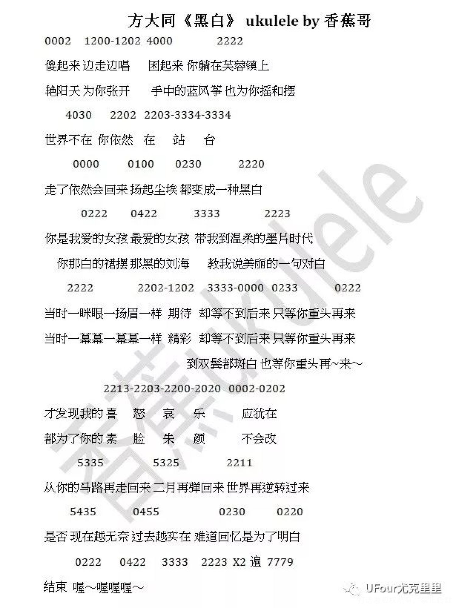 曲谱介绍: Aloha,大家好~这个时间突然更新意不意外?惊不惊喜??? 第二期的"F又在瞎弹什么"给大家带来的曲子来自方大同的《黑白》,这首歌其实我在大学时期就有在弹。当时和香蕉哥一起研究《橙月》整张专辑,这张专辑简直就是宝藏啊。 就是,真的好难弹。 我迟迟没有发这些歌,是因为这些歌真的好难弹,弹一次手就酸了。这一次呢,就是让大家感受一下,方大同的歌弹起来可以多酷。 划重点音频可以在网易云搜:F先森 收听,喜欢的老铁可以多听听,感谢。 谱子也会分享给大家,这个谱子是当年香蕉哥做的,我原封不动的po出来,你们猜猜我们当时是怎么交流的... 这种交流方式还蛮别致的...