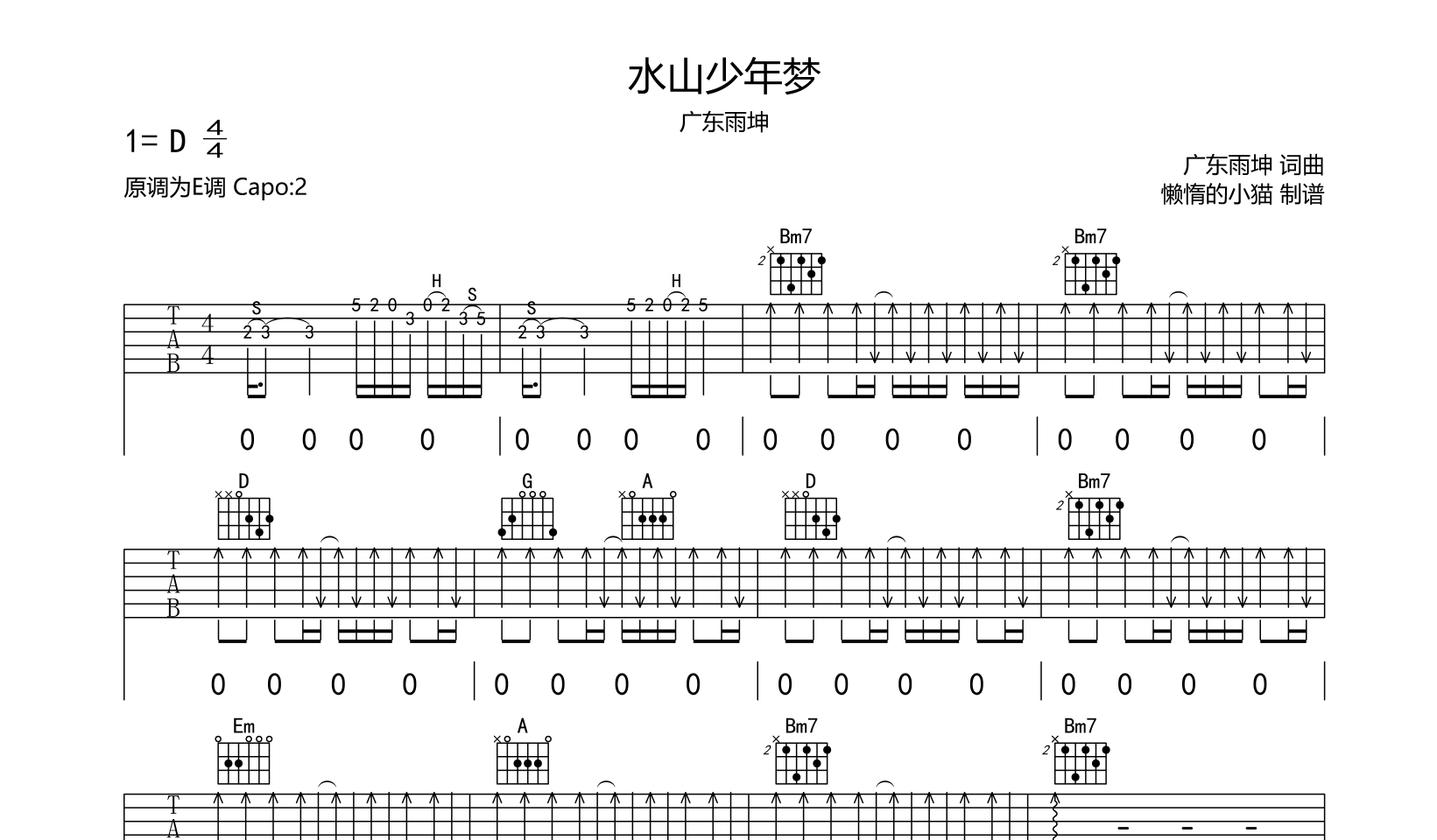 曲谱介绍: 水山少年梦吉他谱,由懒惰的小猫制谱,共3张高清图片谱,原调为E调,使用D调指法编配,原调夹2品,速度80-85拍每分钟,包含完整前奏,难度较简单。
