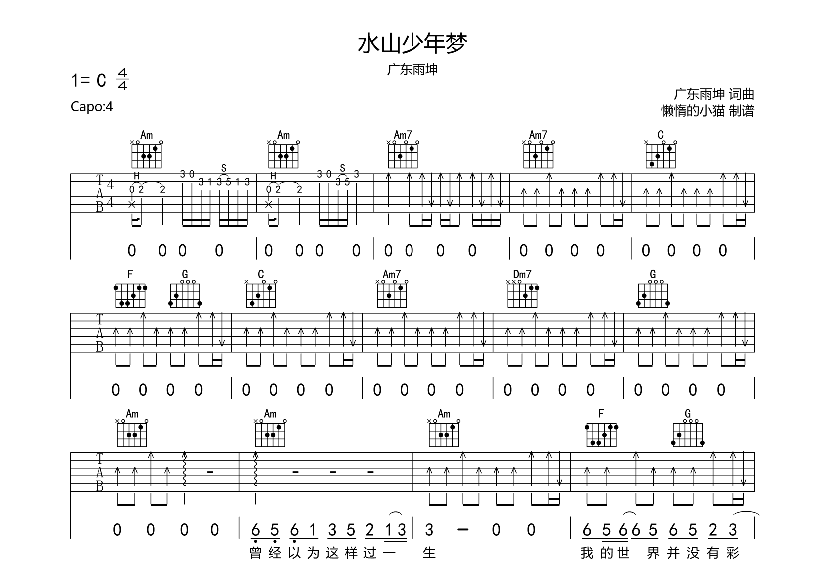 曲谱介绍: 水山少年梦吉他谱,广东雨坤演唱,共3张高清图片谱,由懒惰的小猫制谱,原调为E调,使用C调指法编配,原调夹4品,节奏4/4拍,速度80-85拍每分钟,包含完整前奏,弹唱难度较简单。
