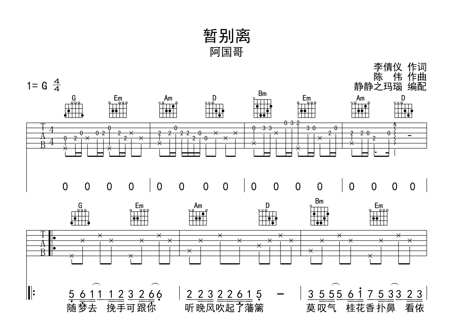 暂别离吉他谱 - 阿国歌 - G调吉他弹唱谱