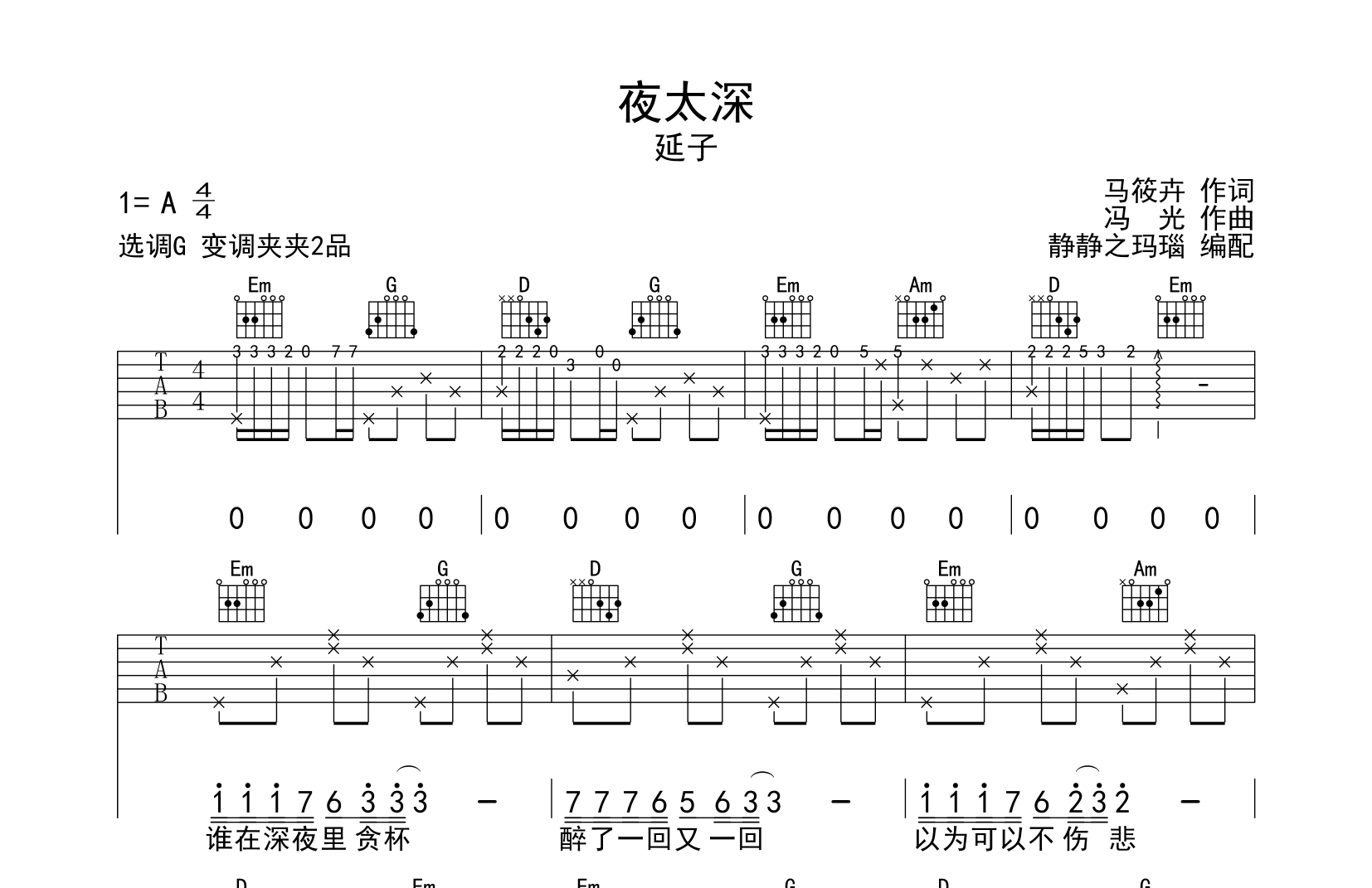 曲谱介绍: 夜太深吉他谱,本谱采用G调和弦指法编配,节奏为4/4拍,速度为60拍每分钟,弹唱建议变调夹夹2品,也可以根据个人嗓音找到一个舒服的位置