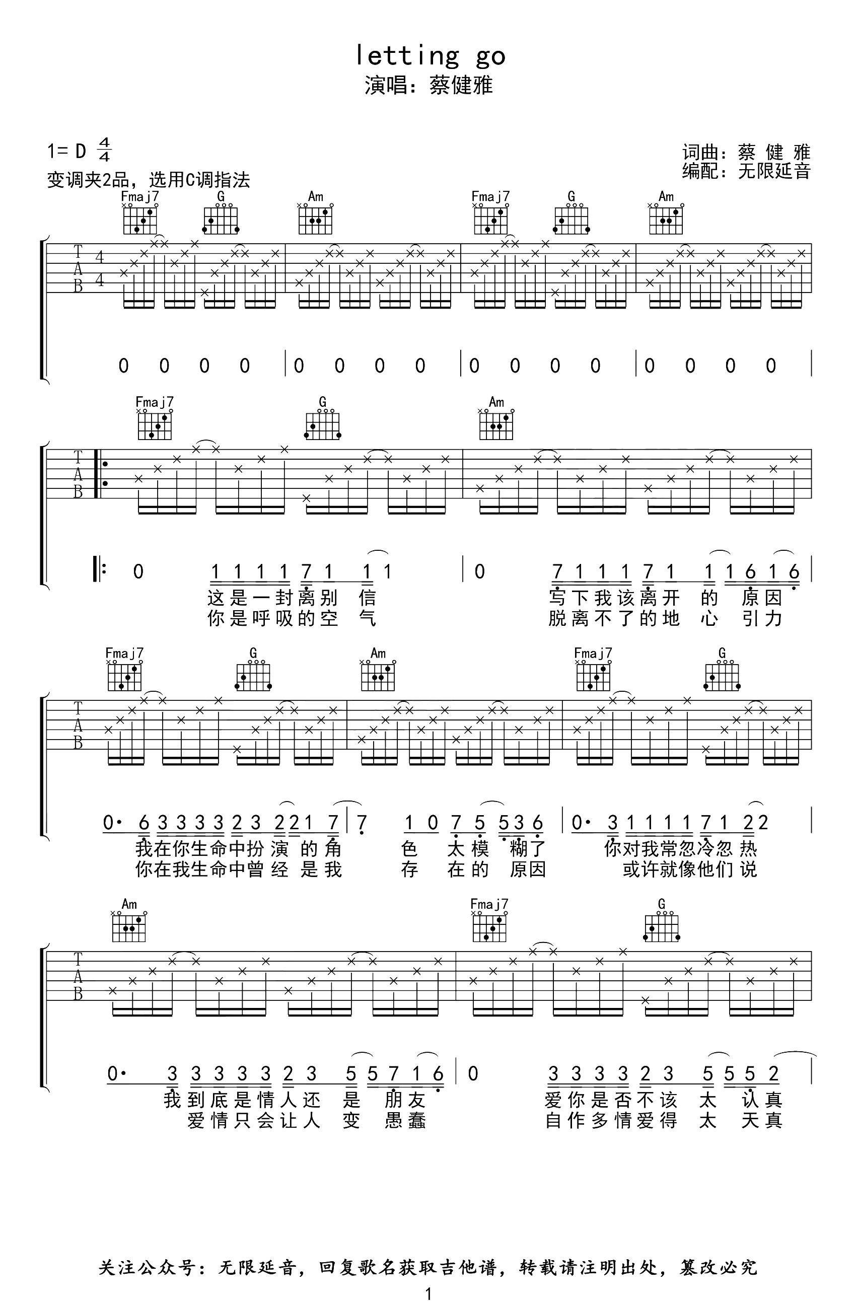 曲谱介绍: 《Letting Go》吉他谱,由无限延音制谱,共3张高清图片谱,C调指法吉他弹唱谱,原调为D调,推荐夹变调夹2品,节奏4/4拍,难度较简单。