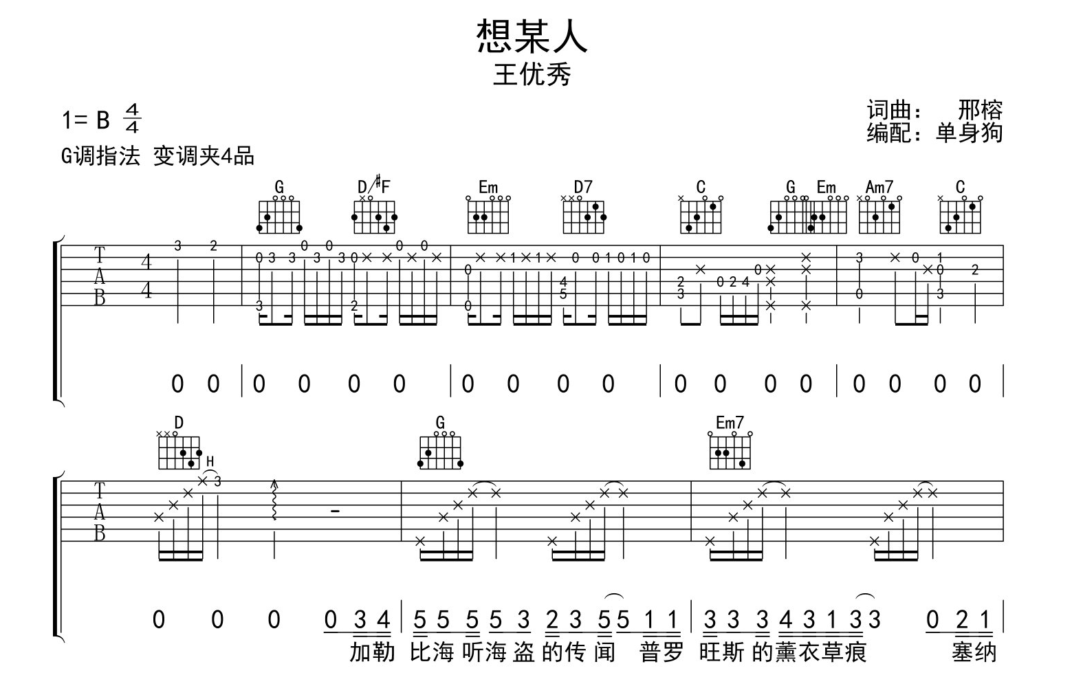 曲谱介绍: 想某人吉他谱,共2张高清图片谱,G调吉他弹唱谱,原调为B调,变调夹夹4品弹唱原调,包含完整的前奏/间奏/尾奏,节奏4/4拍,弹唱难度较为简单,由创作者单身狗制谱。
