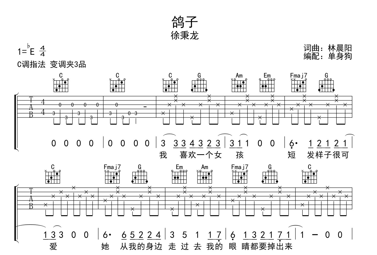 曲谱介绍: 来自单身狗制谱的《鸽子》吉他谱,共2张高清图片谱,C调指法吉他弹唱谱,原调bE,变调夹夹3品弹唱,难度较简单。