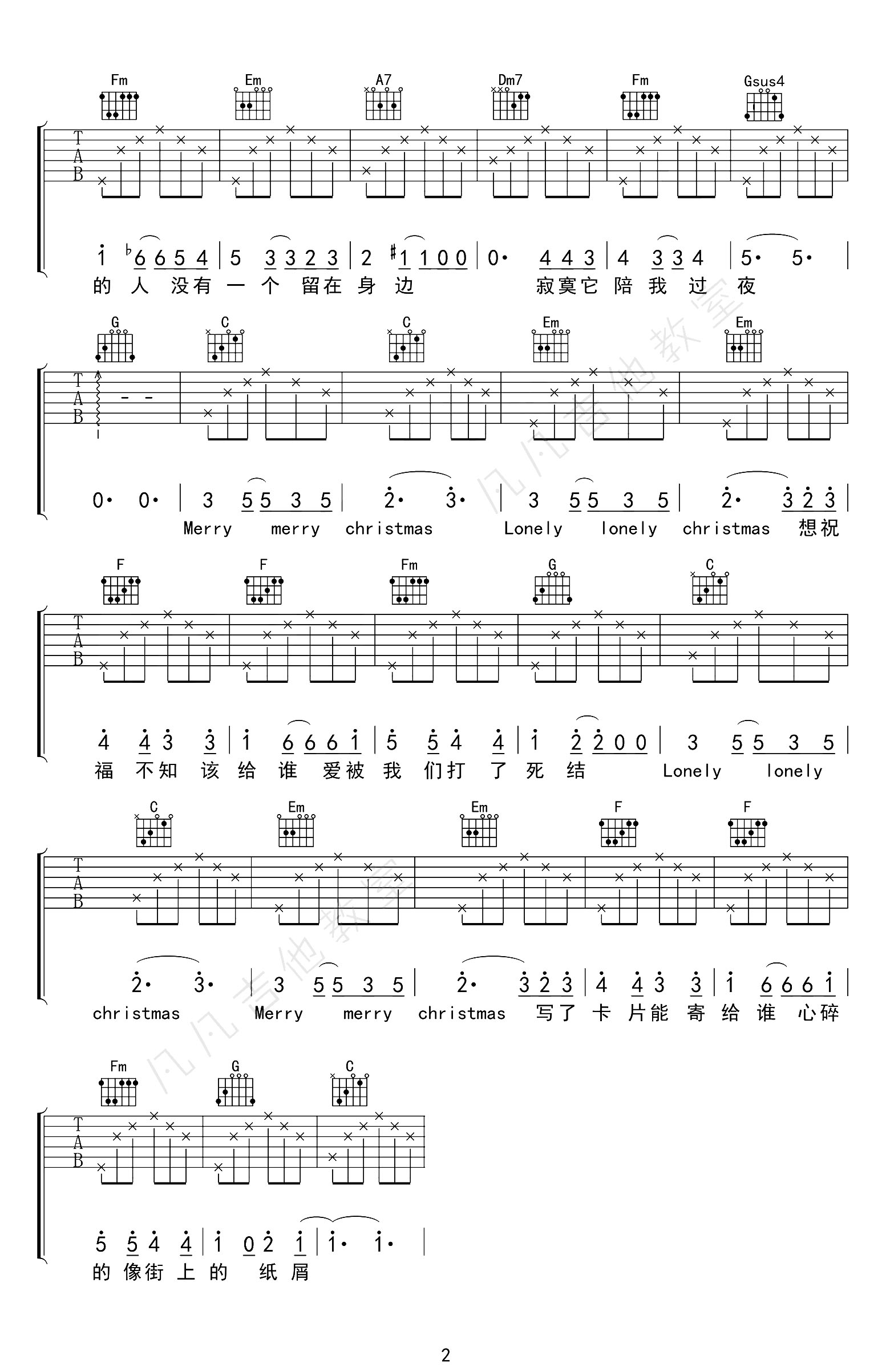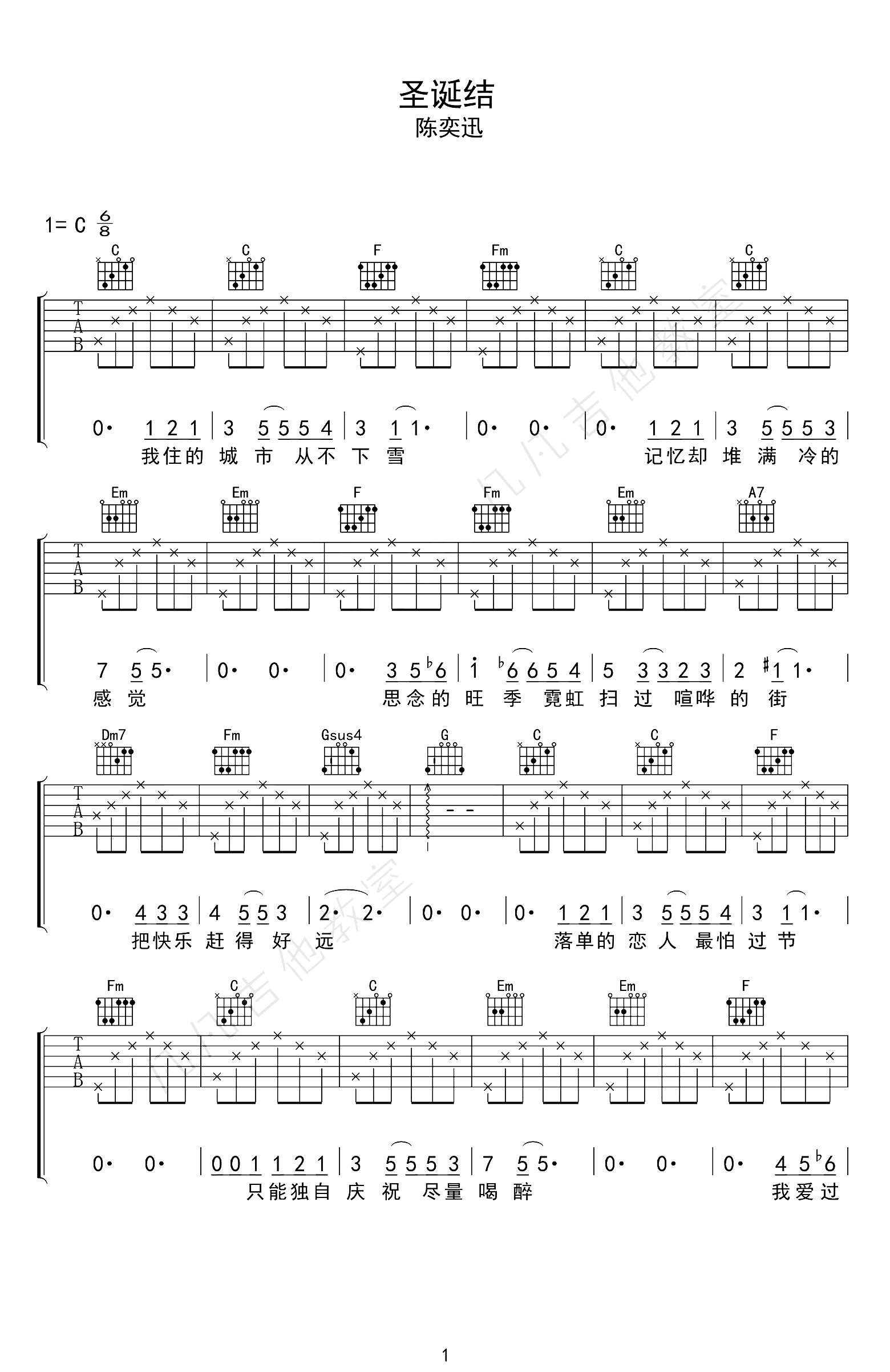 曲谱介绍: 由凡凡吉他教室制谱的《圣诞结》吉他谱,下方包含视频弹唱演示+教学,总共2张高清图片谱,选用C调指法编配,标准调音弹唱可不用变调夹,按简版的分解和弦方式弹奏但还原度还是不错,难度初级简单。 陈奕迅《圣诞结》吉他弹唱教学