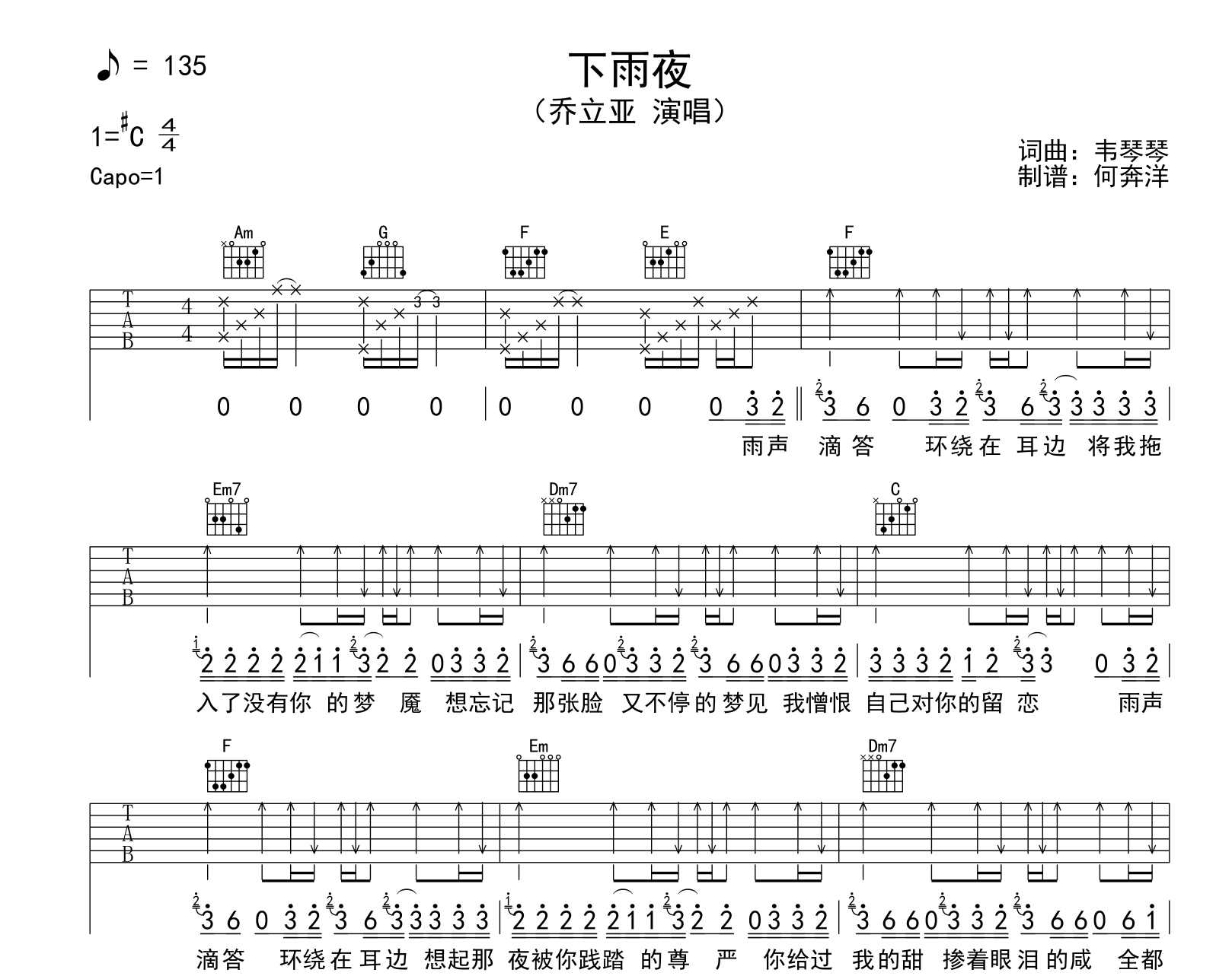 下雨夜吉他谱 - 乔立亚 - C调吉他弹唱谱 - 原版
