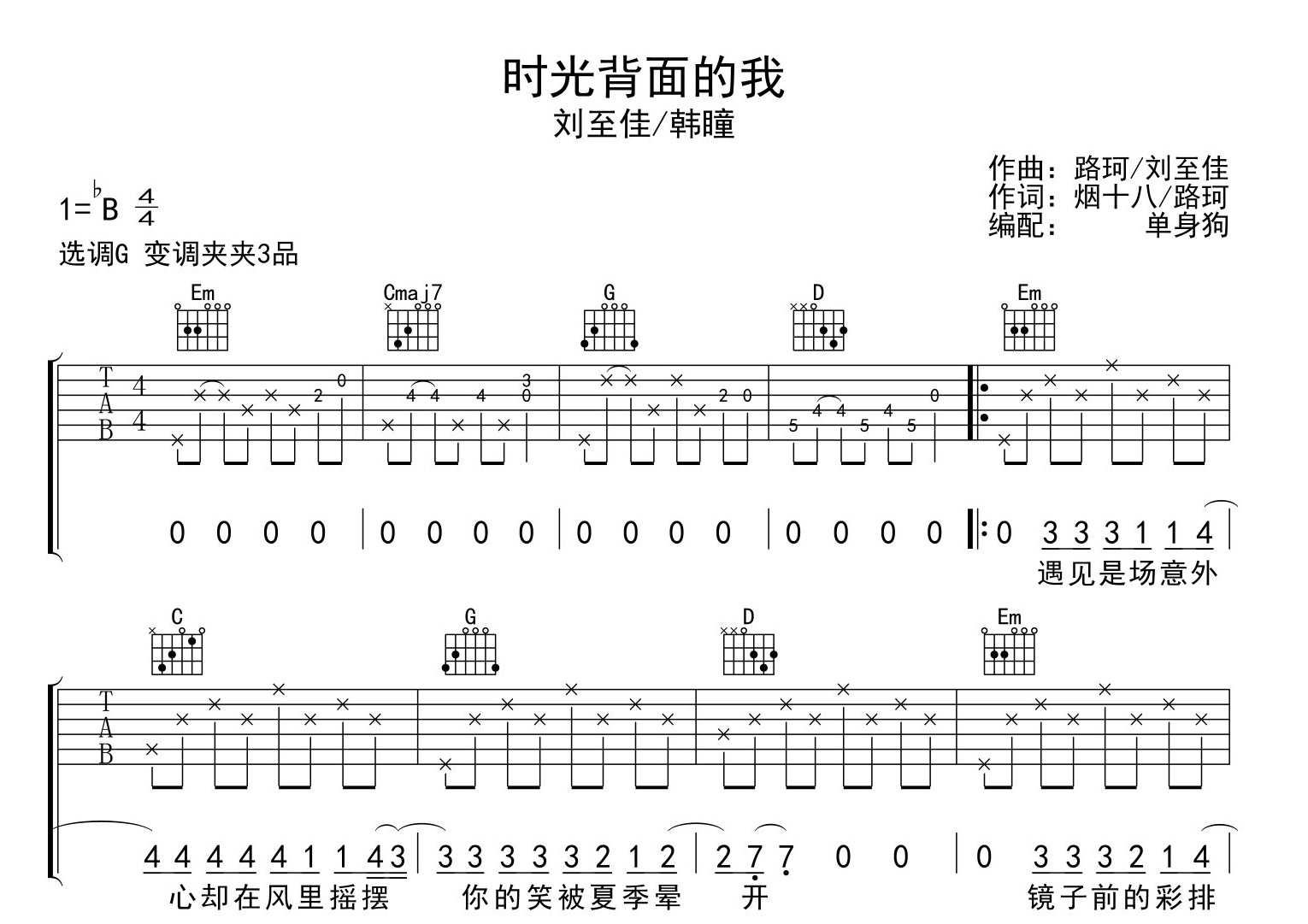 曲谱介绍: 《时光背面的我》吉他谱,由@单身狗制谱,共3张高清图片谱,原调bB,选用G调指法,变调夹建议夹3品弹唱原调,难度较简单。