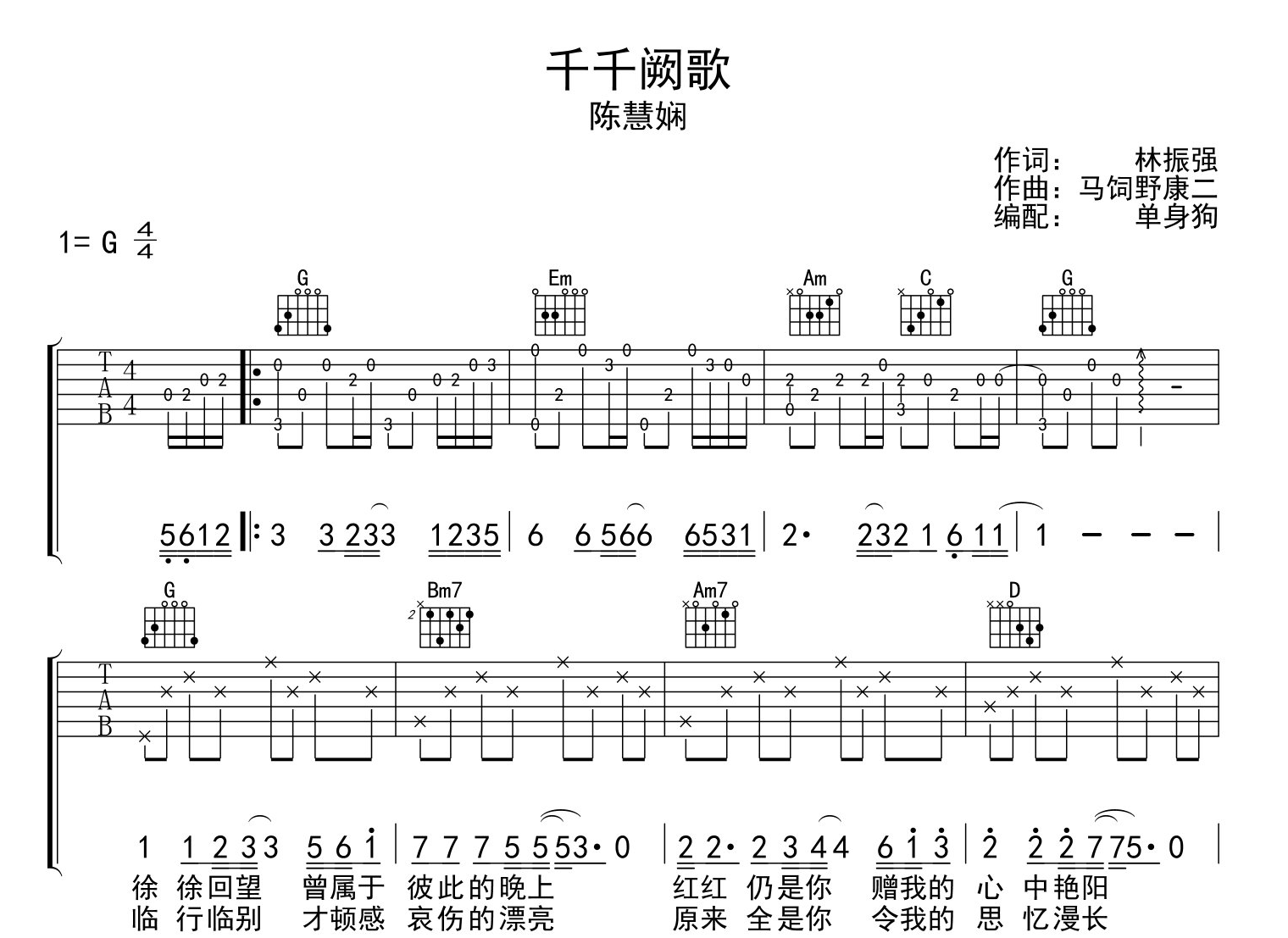 曲谱介绍: 《千千阙歌》吉他谱,共3张高清图片谱,由@单身狗制谱,选用G调指法编配,男生可不用变调夹,女生可以考虑2-3品位置弹唱,包含完整的前奏按原版编配,弹唱难度较简单。
