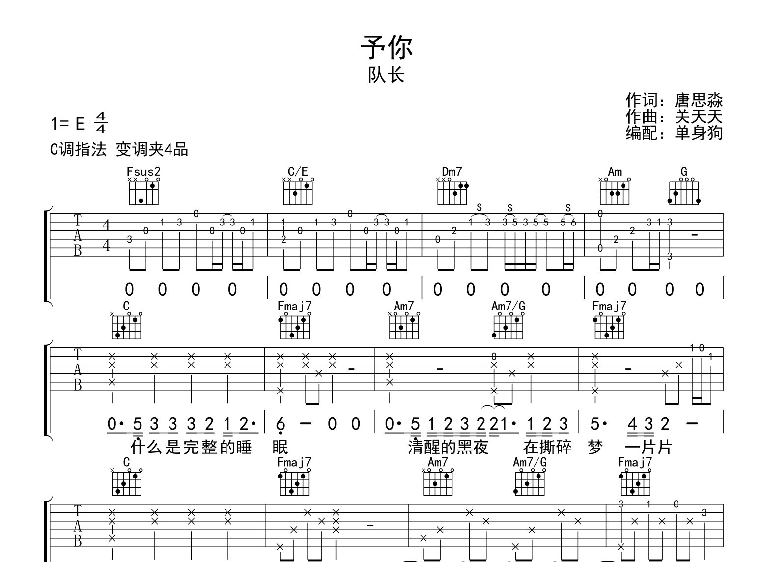 曲谱介绍: 由@单身狗制谱的《予你》吉他谱,共有3张高清图片谱,原调是E调,选用C调指法,变调夹夹4品弹唱原调,包含前奏,难度较为简单。