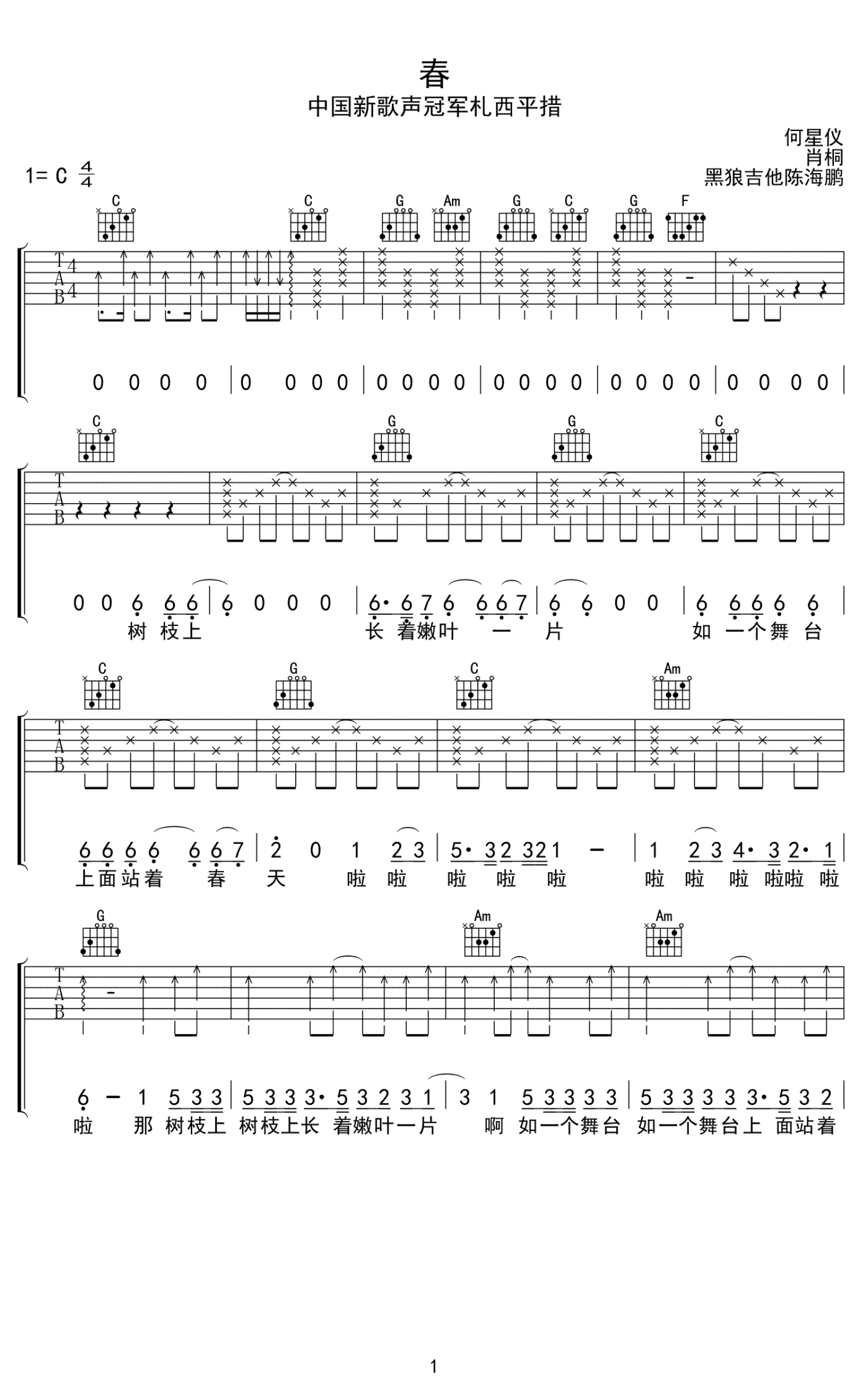 曲谱介绍: 春吉他谱,中国新歌声冠军扎西平措演唱,春六线谱,C调指法,高清弹唱图片谱。来自西藏日喀则的藏族小伙子带来的一首让人感受万物生长之美的歌曲