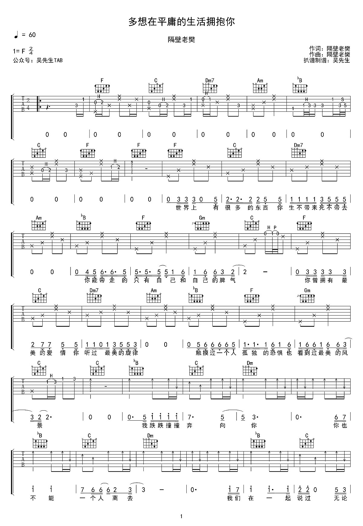 曲谱介绍: 《多想在平庸的生活拥抱你》吉他谱【附演示音频】,由@吴先生制谱,共2张高清图片谱例,选用F调指法,可不用变调夹,节奏2/4拍,速度60BPM,按原曲版本编配,弹唱难度较简单。 吉他弹唱预览音频: