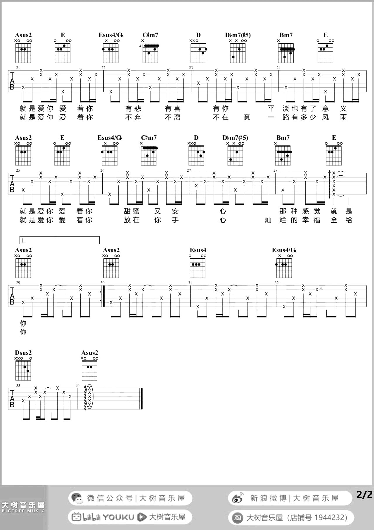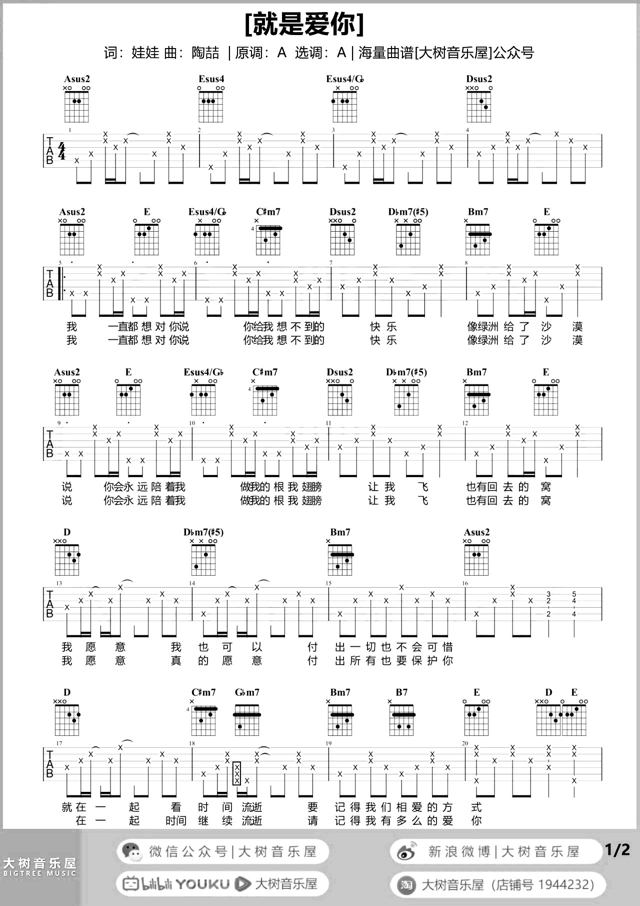 曲谱介绍: 由@大树音乐屋制谱的《就是爱你》吉他谱【演示+教学】,有2张高清六线谱例,A调吉他弹唱谱,原调A调,可不用变调夹,下方附有女生版的《就是爱你》吉他弹唱演示+教学,大家可以跟随视频进行弹唱练习。 《就是爱你》吉他弹唱演示 《就是爱你》吉他弹唱教学