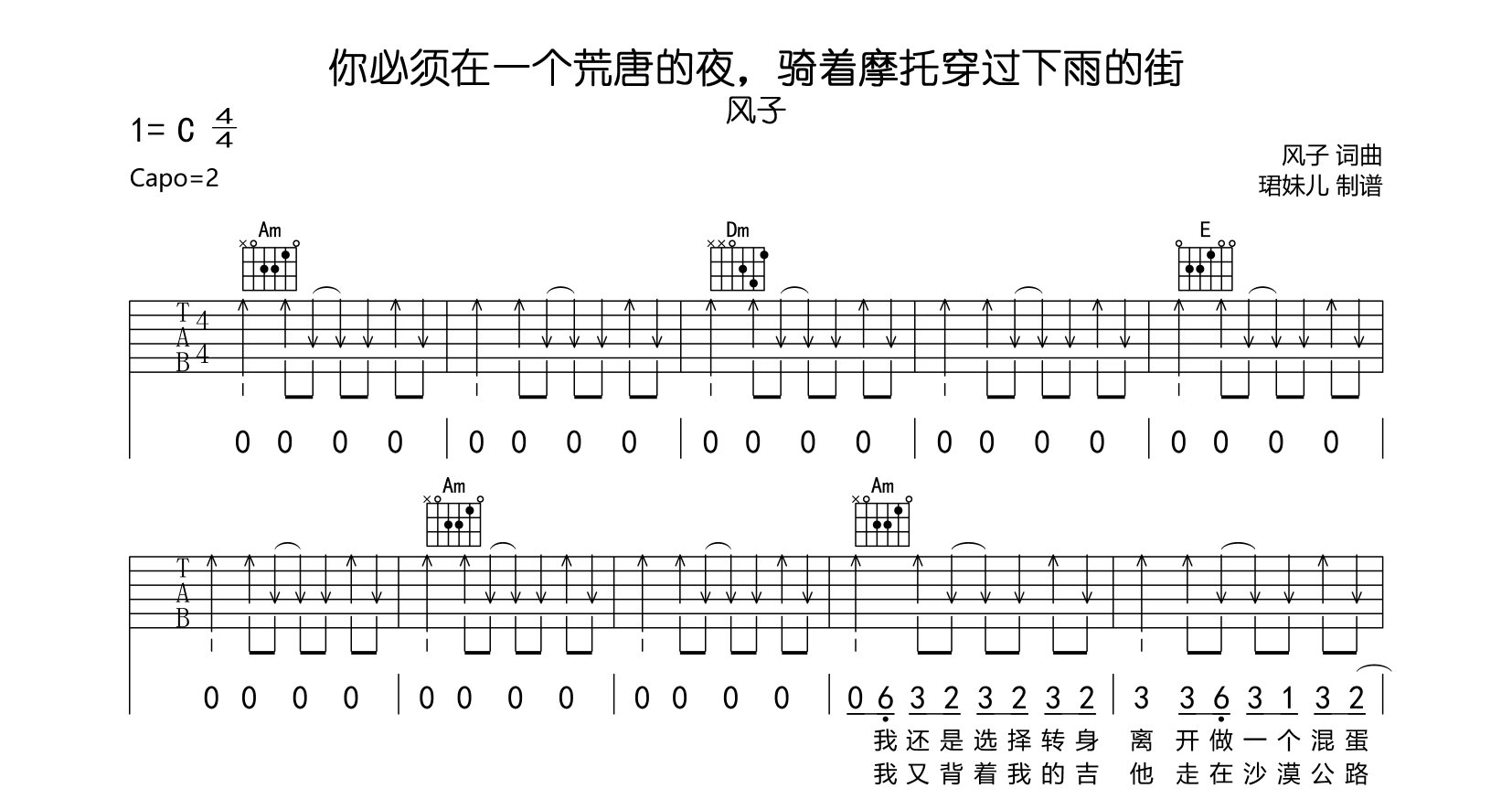 你必须在一个荒唐的夜,骑着摩托穿过下雨的街吉他谱 - 风子 - C调吉他弹唱谱