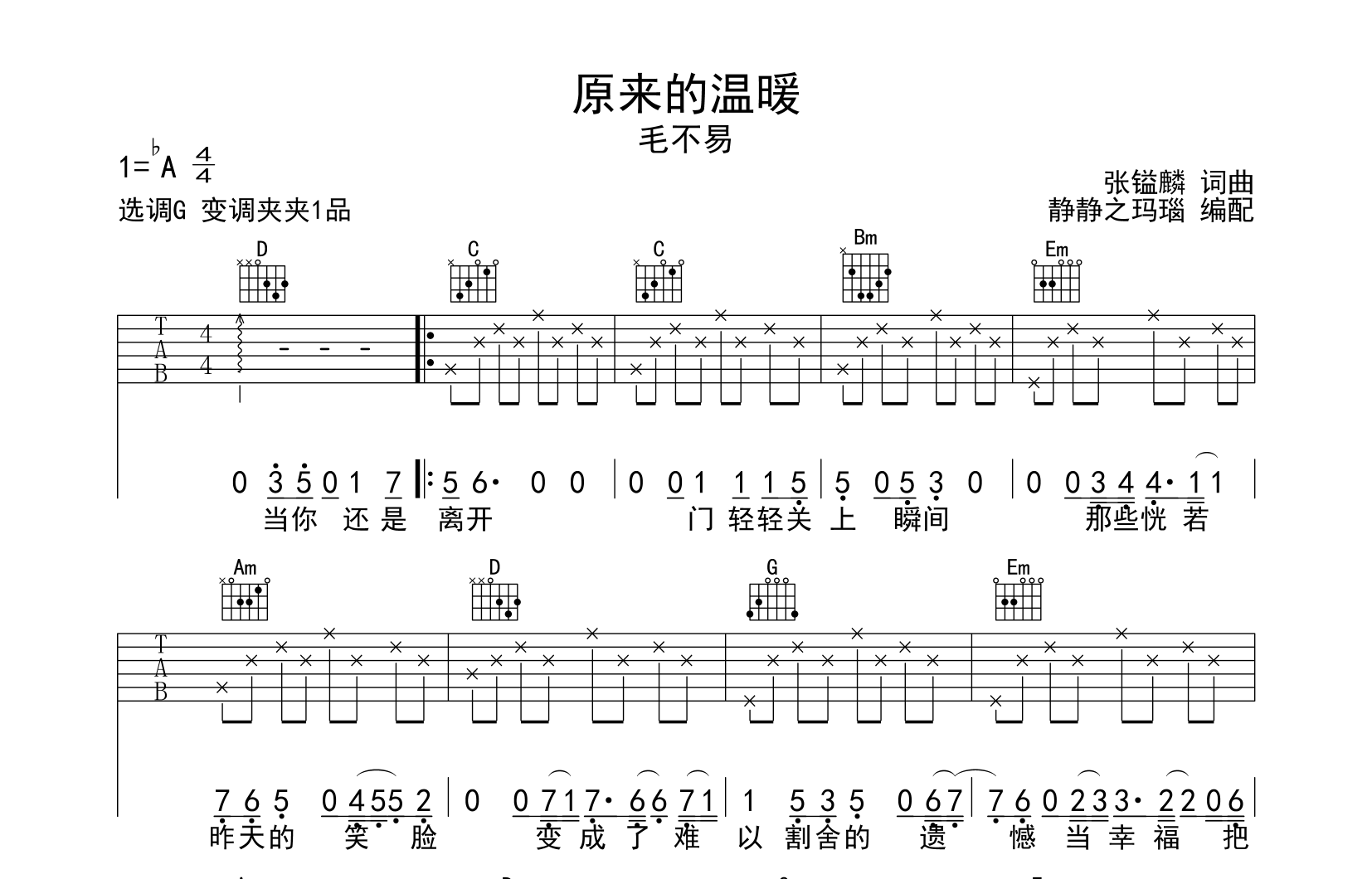 曲谱介绍: 原来的温暖吉他谱,由@静静之玛瑙制谱,共2张高清图片谱,本谱采用G调和弦指法编配,节奏为4/4拍,速度为80拍每分钟,弹唱建议变调夹夹1品,难度较简单。