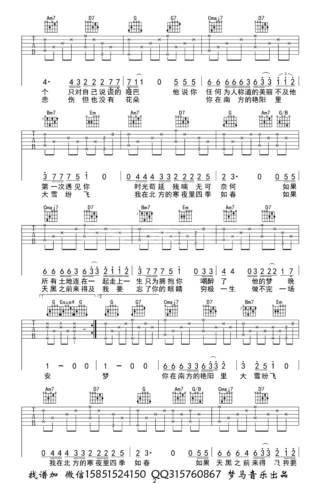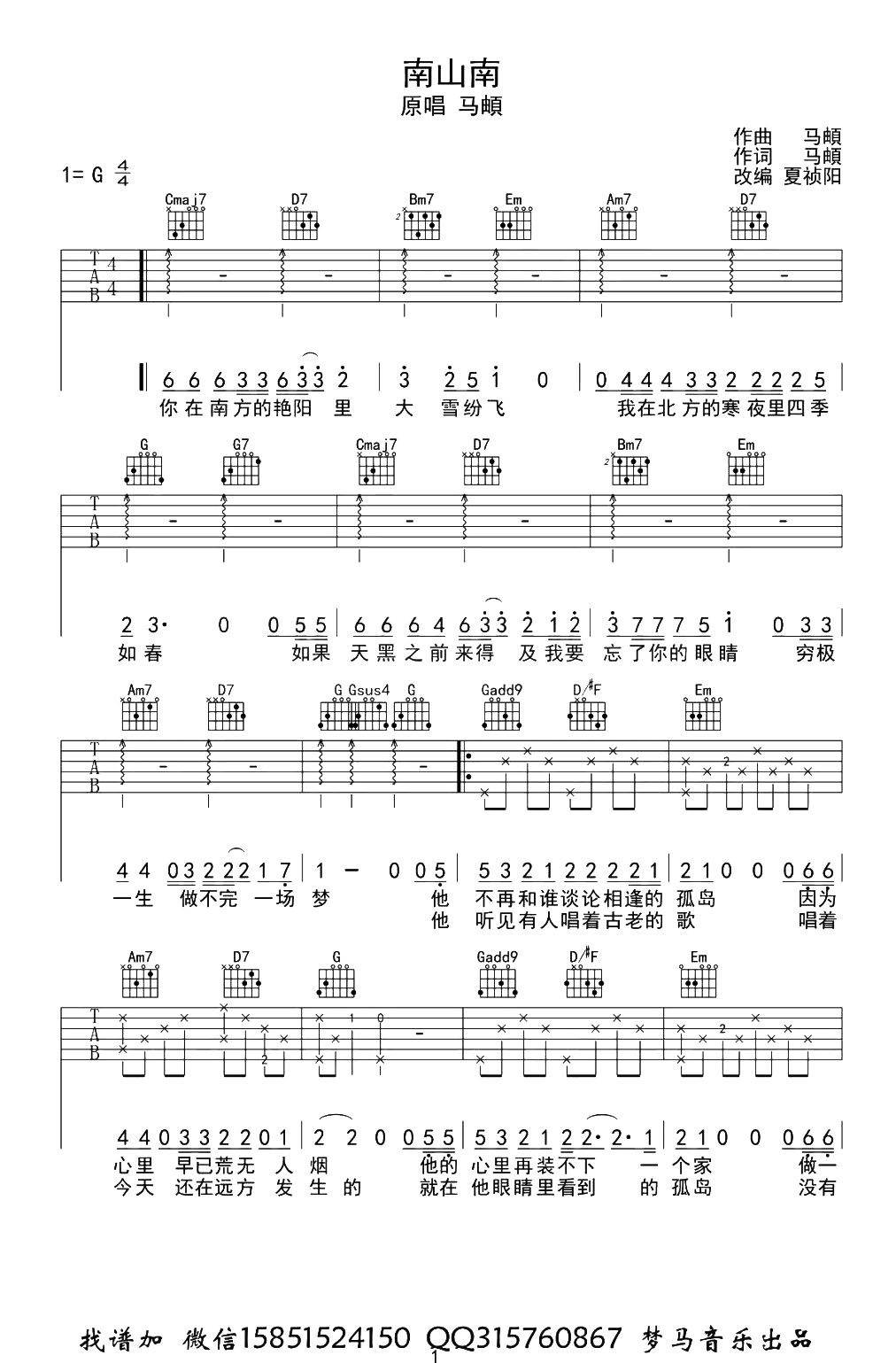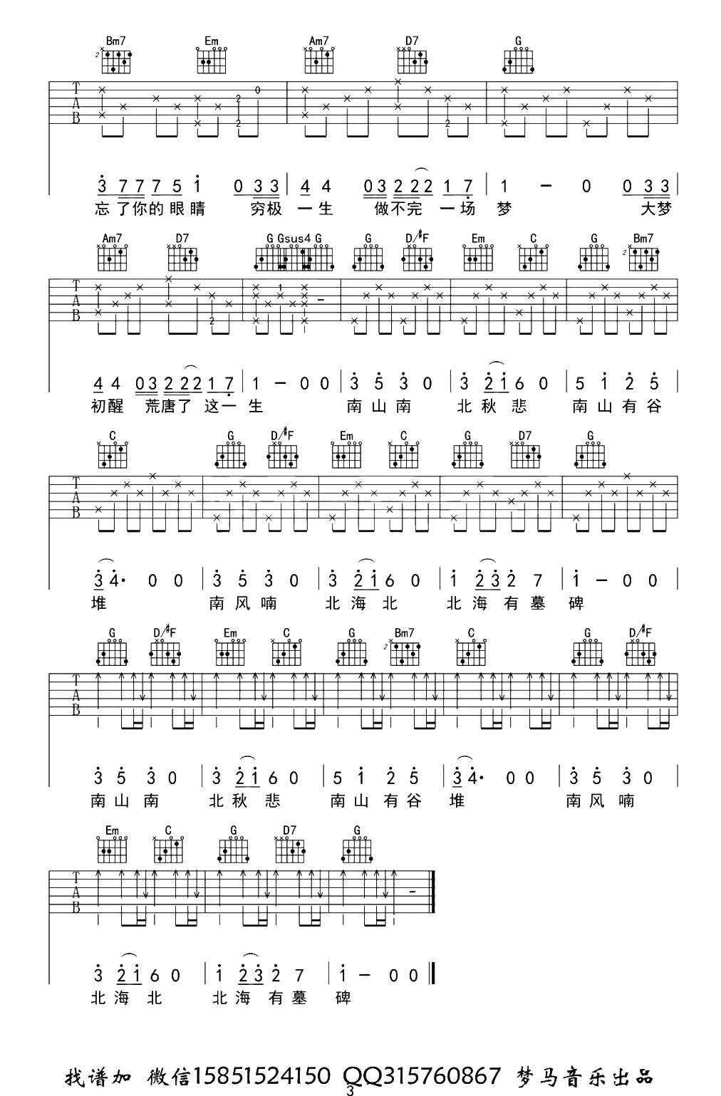 曲谱介绍: 由@梦马音乐制谱的《南山南》吉他谱,共3张高清图片谱例,本谱为G调吉他弹唱谱,版本完整,节奏4/4拍,弹唱难度较简单。