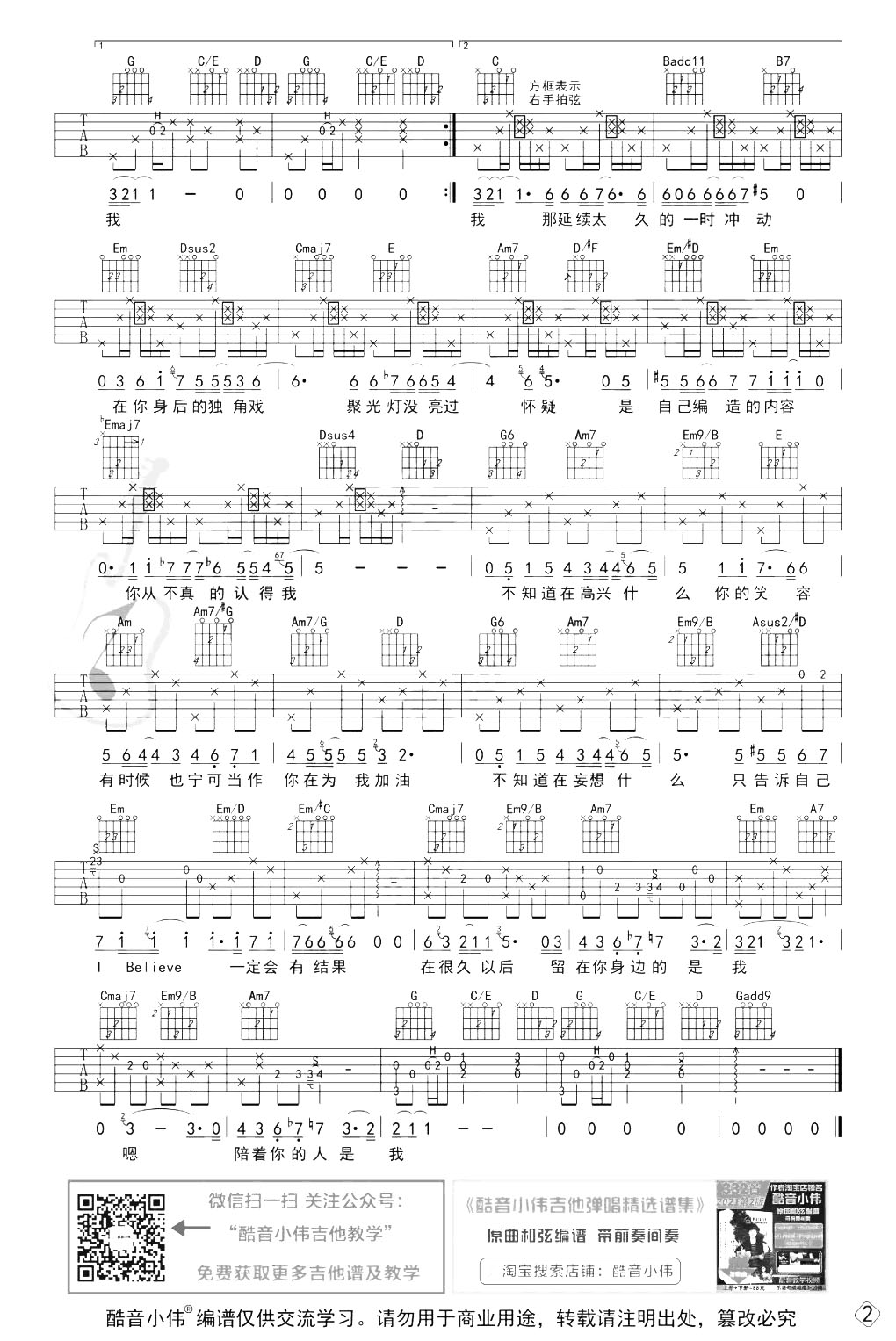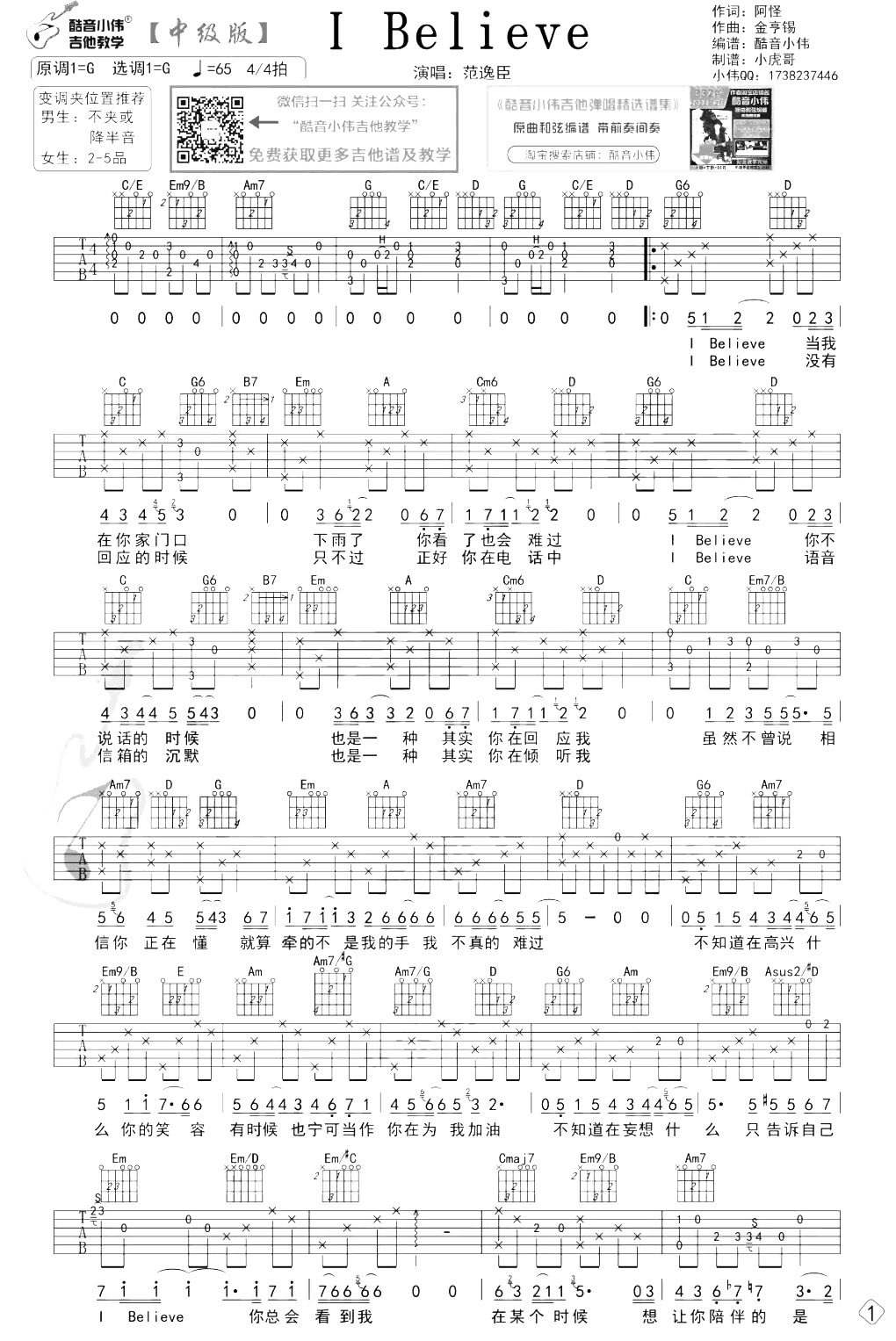 曲谱介绍: 范逸臣《I Believe》吉他谱【附弹唱+教学视频】,由酷音小伟制谱,共2张高清六线谱例,本谱为G调吉他弹唱谱,原调G调,男生不用变调夹,女生建议2-5品,速度65BPM,节奏4/4拍,按原版编配,难度较简单。随谱附《I Believe》吉他弹唱演示视频+教学视频,大家可参考练习。