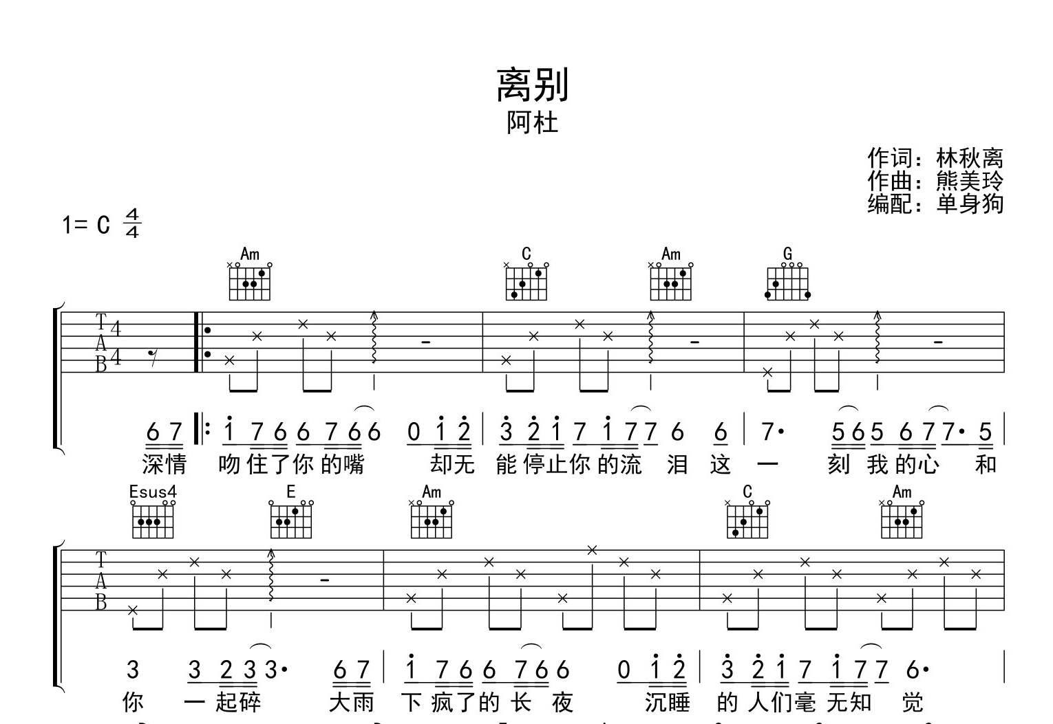 离别吉他谱 - 阿杜 - C调吉他弹唱谱