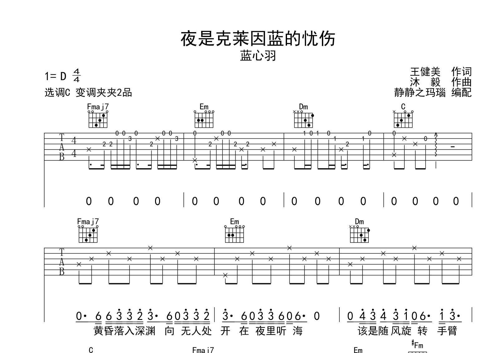 曲谱介绍: 夜是克莱因蓝的忧伤吉他谱,由@静静之满脑制谱,本谱采用C调和弦指法编配,节奏为4/4拍,速度为80拍每分钟,弹唱建议变调夹夹2品,也可以根据个人嗓音找到一个舒服的位置,弹唱难度较简单。
