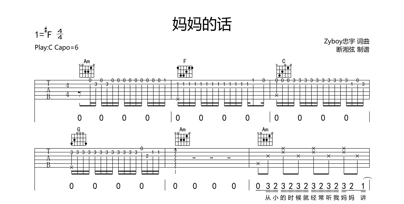 曲谱介绍: 《妈妈的话》吉他谱,共有3张高清图片谱例,本谱为C调编配吉他谱,变调夹夹6品,速度为每分钟85拍,节奏4/4拍,弹唱难度较简单,由@断湘弦制谱。
