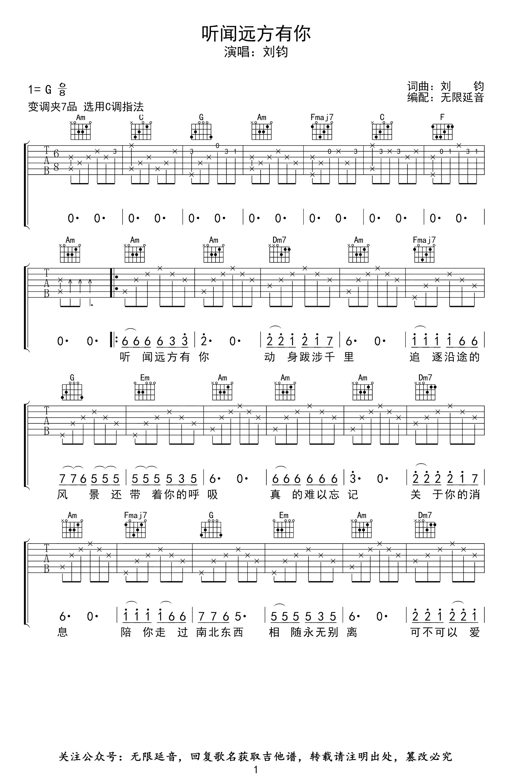 听闻远方有你吉他谱 - 刘钧 - C调吉他弹唱谱 - 原版