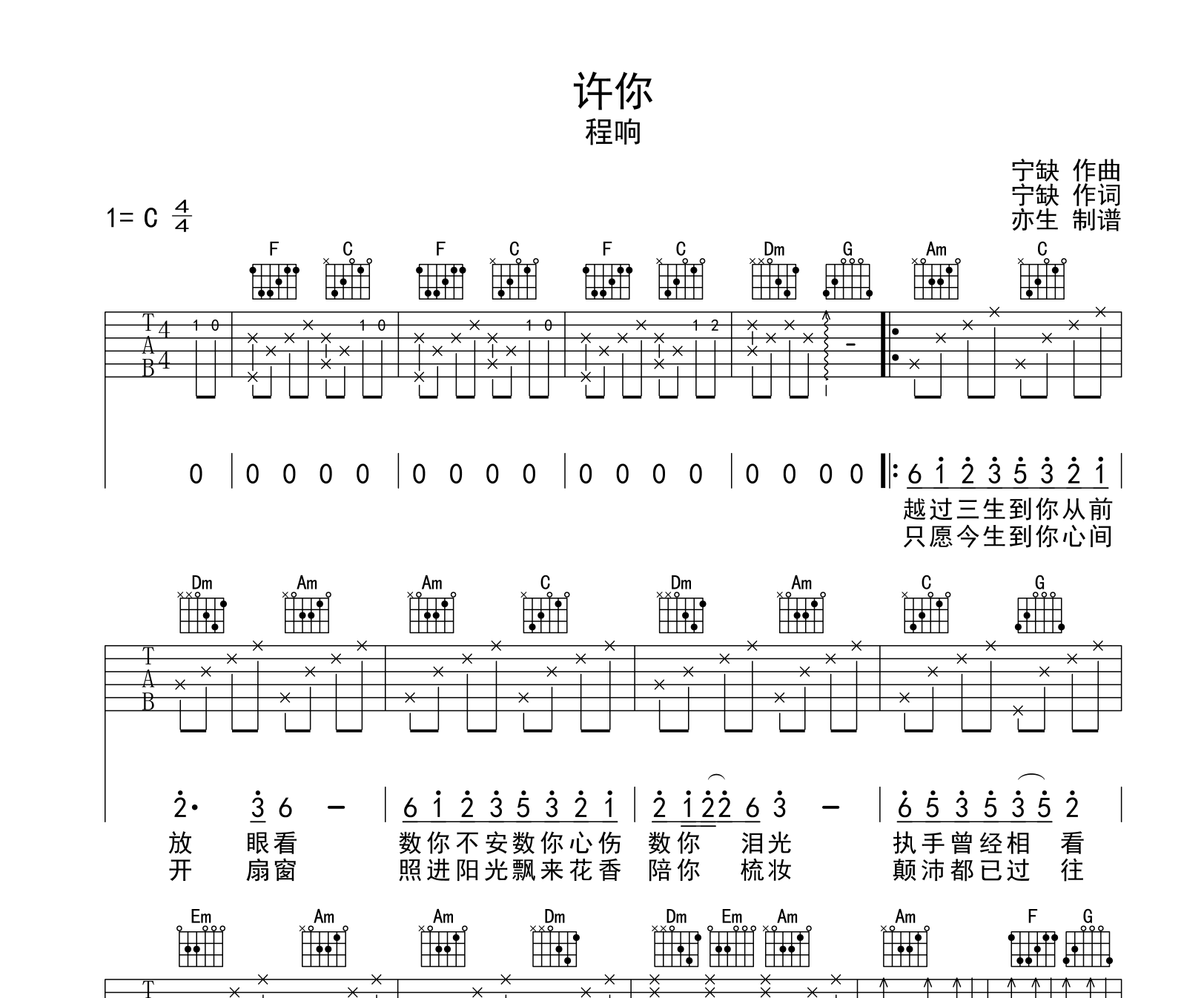曲谱介绍: 程响许你吉他谱,由@亦生制谱,共有3张高清六线谱图例,本谱采用C调和弦指法编配,节奏为4/4拍,速度为95拍每分钟,弹唱建议变调夹夹不夹,难度较简单。