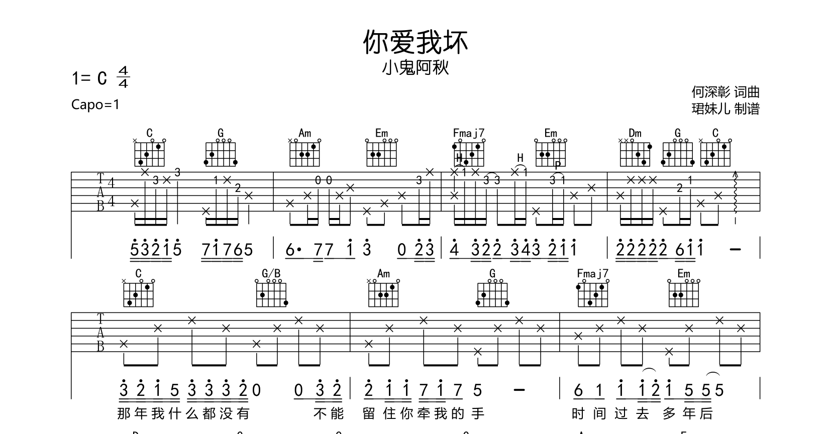 曲谱介绍: 由@珺妹儿制谱的《你爱我坏》吉他谱,共有2张高清图片六线谱,本谱C调吉他弹唱谱,弹唱建议变调夹1品,弹唱#C原调,节奏4/4拍,速度60BPM,难度较简单。