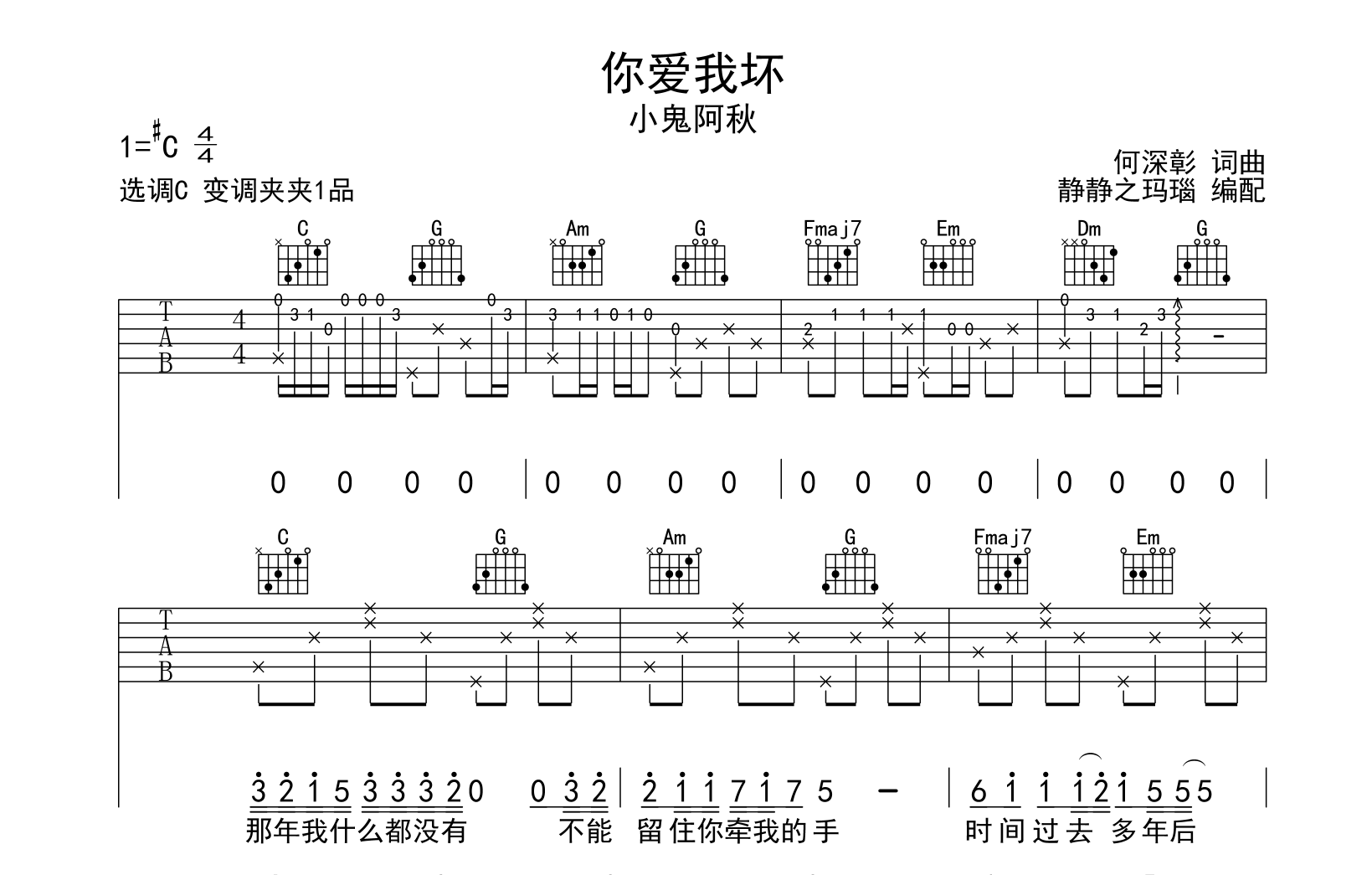 你爱我坏吉他谱 - 小鬼阿秋 - C调吉他弹唱谱