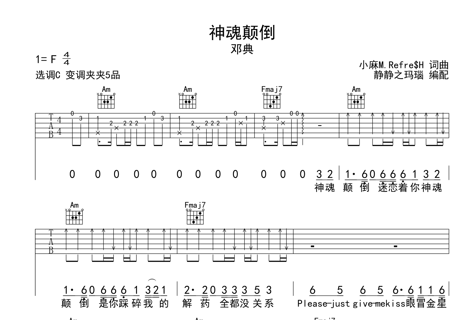 曲谱介绍: 由@静静之玛瑙制谱的《神魂颠倒》吉他谱,共3张高清图片谱例,本谱采用C调和弦指法编配,节奏为4/4拍,速度为100拍每分钟,弹唱建议变调夹夹5品,也可以根据个人嗓音找到一个舒服的位置,弹唱较简单。