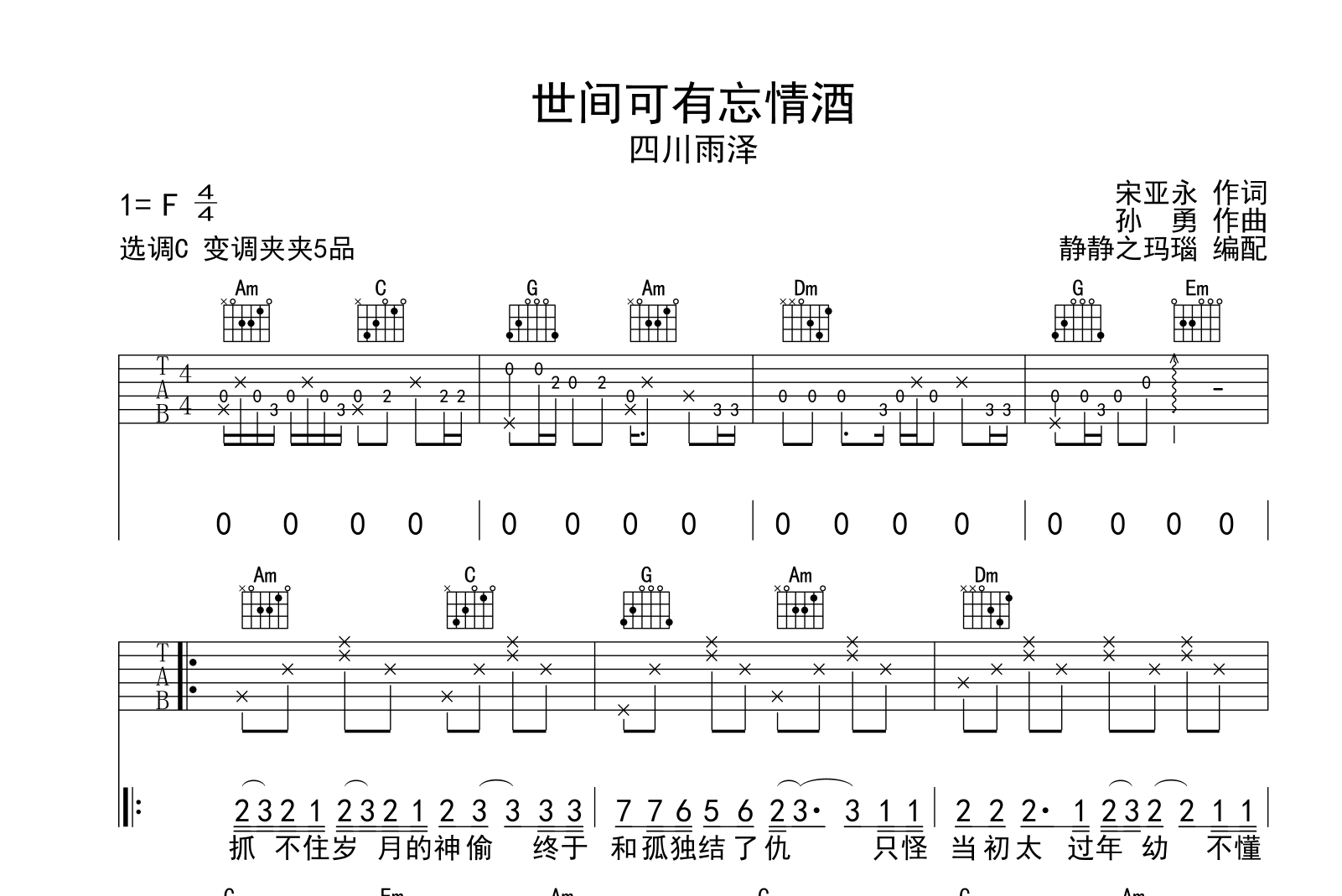 世间可有忘情酒吉他谱 - 四川雨泽 - C调吉他弹唱谱 - 原版