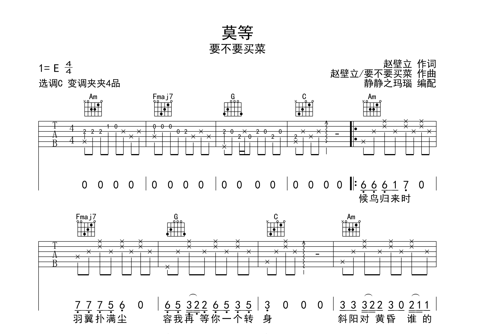 曲谱介绍: 由@静静之玛瑙制谱的《莫等》吉他谱,共2张高清图片谱例,本谱采用C调和弦指法按原版编配,节奏为4/4拍,速度为80拍每分钟,弹唱建议变调夹夹4品,也可以根据个人嗓音找到一个舒服的位置,难度较简单。