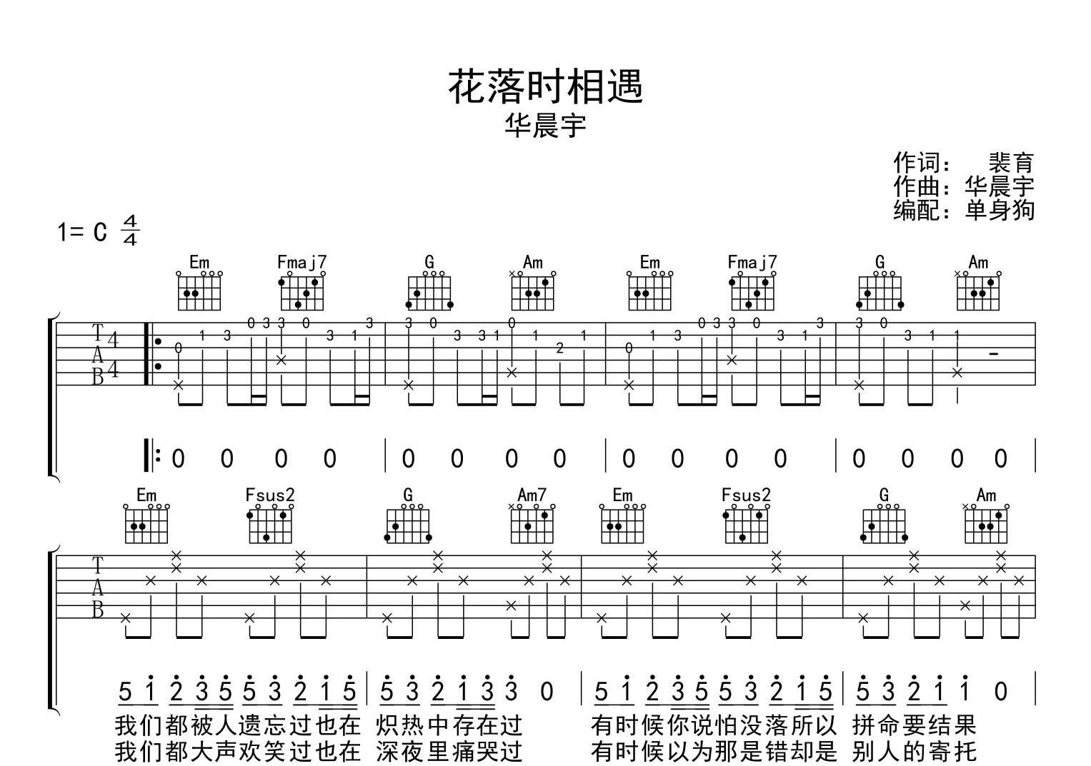 花落时相遇吉他谱 - 华晨宇 - C调吉他弹唱谱