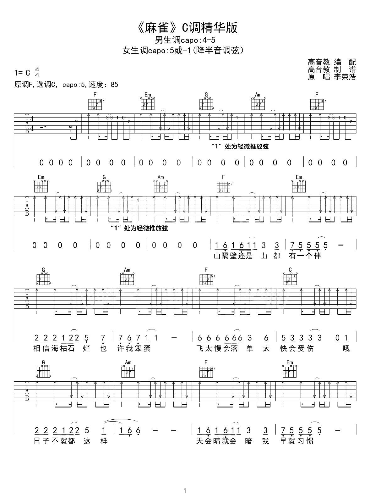 曲谱介绍: 由高音教编配和制谱的《麻雀》吉他谱,共有3张高清六线谱图例,本谱为C调吉他弹唱谱,原调是F,变调夹可以夹5品弹唱原调,节奏4/4拍,速度85BPM,弹唱难度适中,随谱附《麻雀》吉他弹唱演示视频,大家可参考视频结合练习。 《麻雀》吉他弹唱演示视频