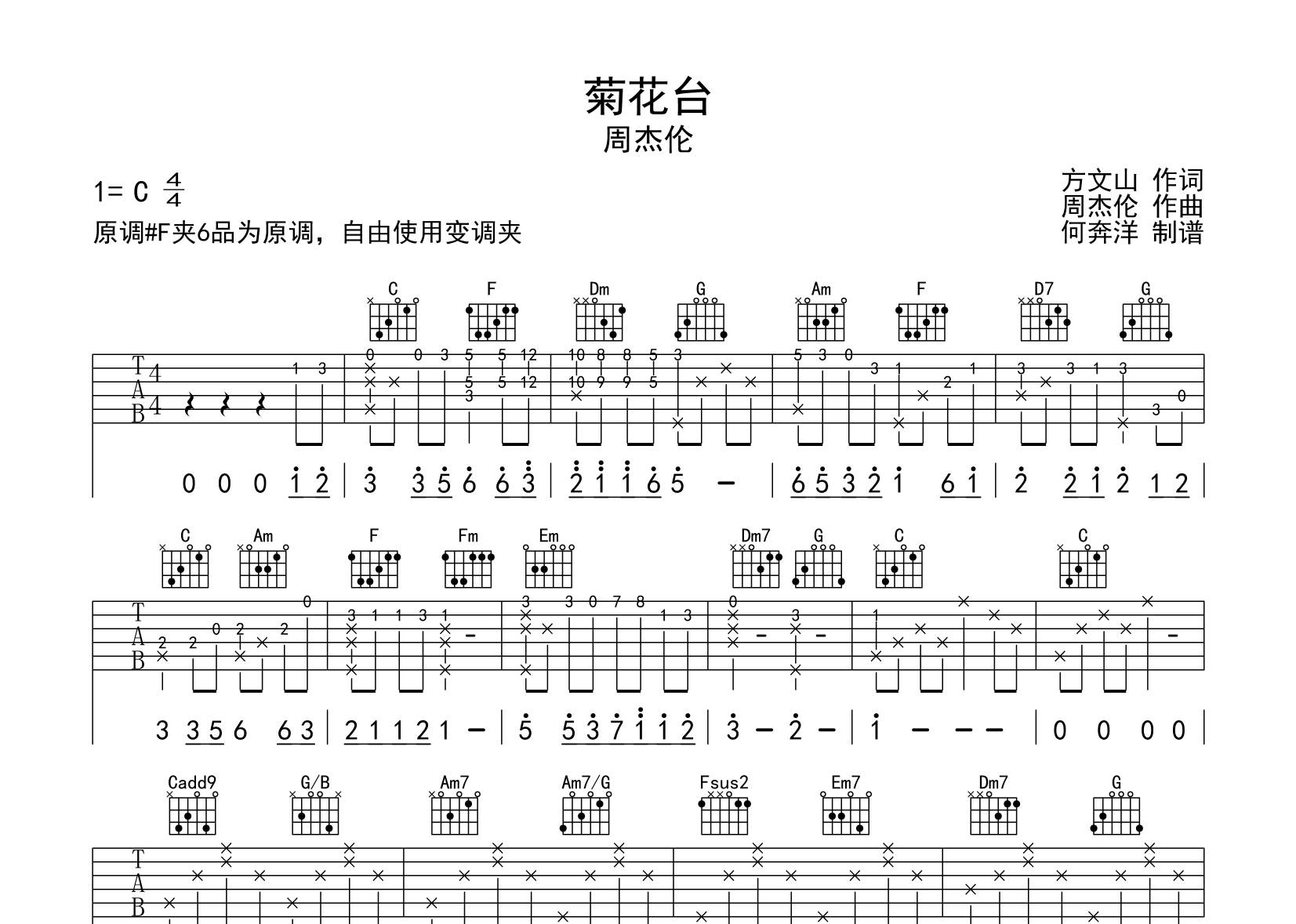 曲谱介绍: 《菊花台》吉他谱,由@何奔洋制谱,共2张高清图片谱里,本谱为C调吉他弹唱谱,按原版降调编配,变调夹Capo六平为原调,前奏间奏尾奏齐全,弹唱难度适中。