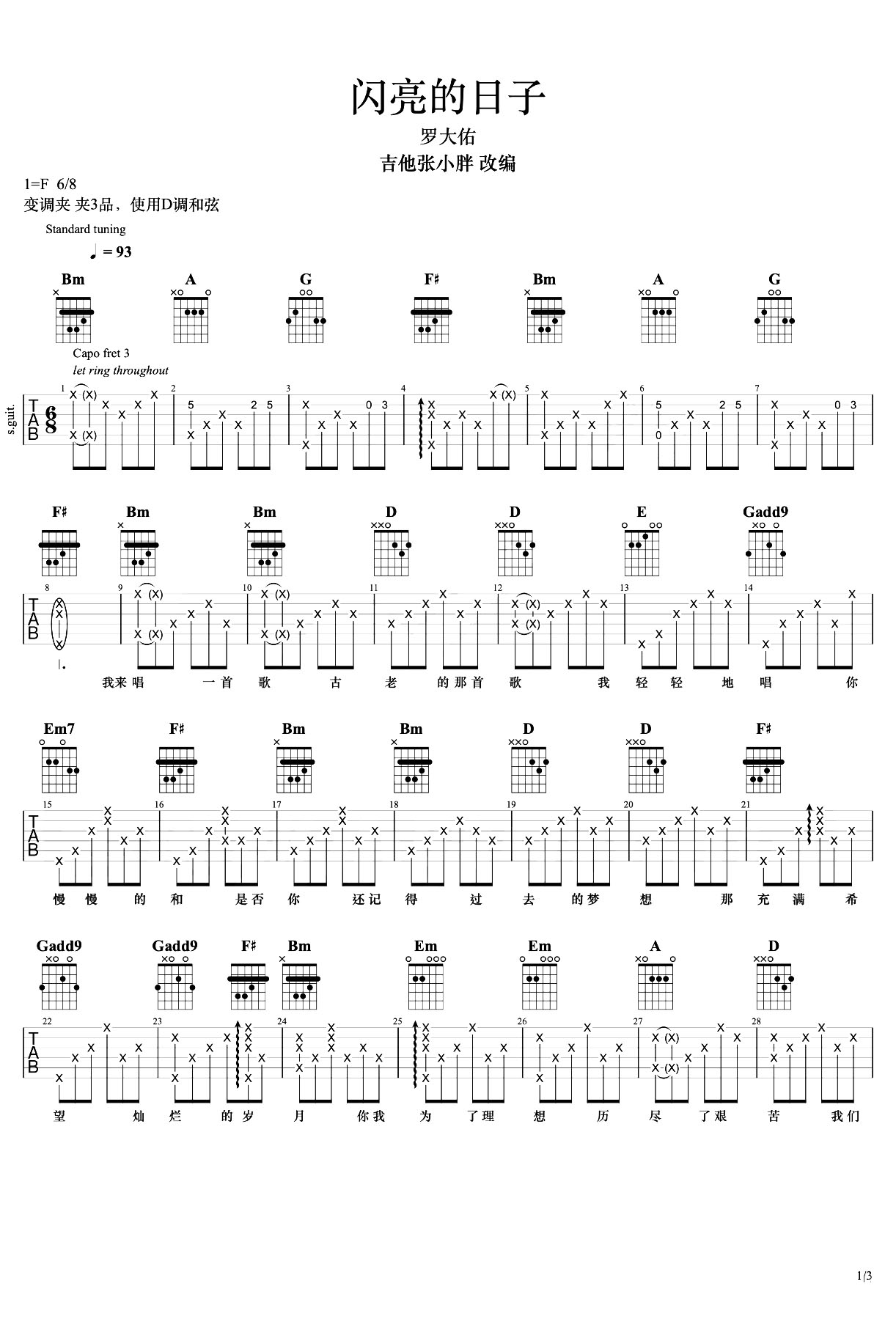 曲谱介绍: 由吉他张小胖制谱的《闪亮的日子》吉他谱【附弹唱演示】,共有3张高清六线谱图例,本谱为D调吉他弹唱谱,变调夹可夹3品弹唱原调F调,节奏6/8拍,速度93BPM,按原版编配,弹唱难度较简单。 《闪亮的日子》吉他弹唱演示视频