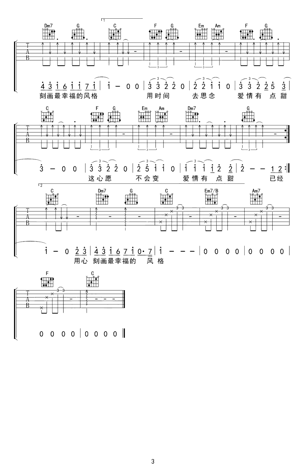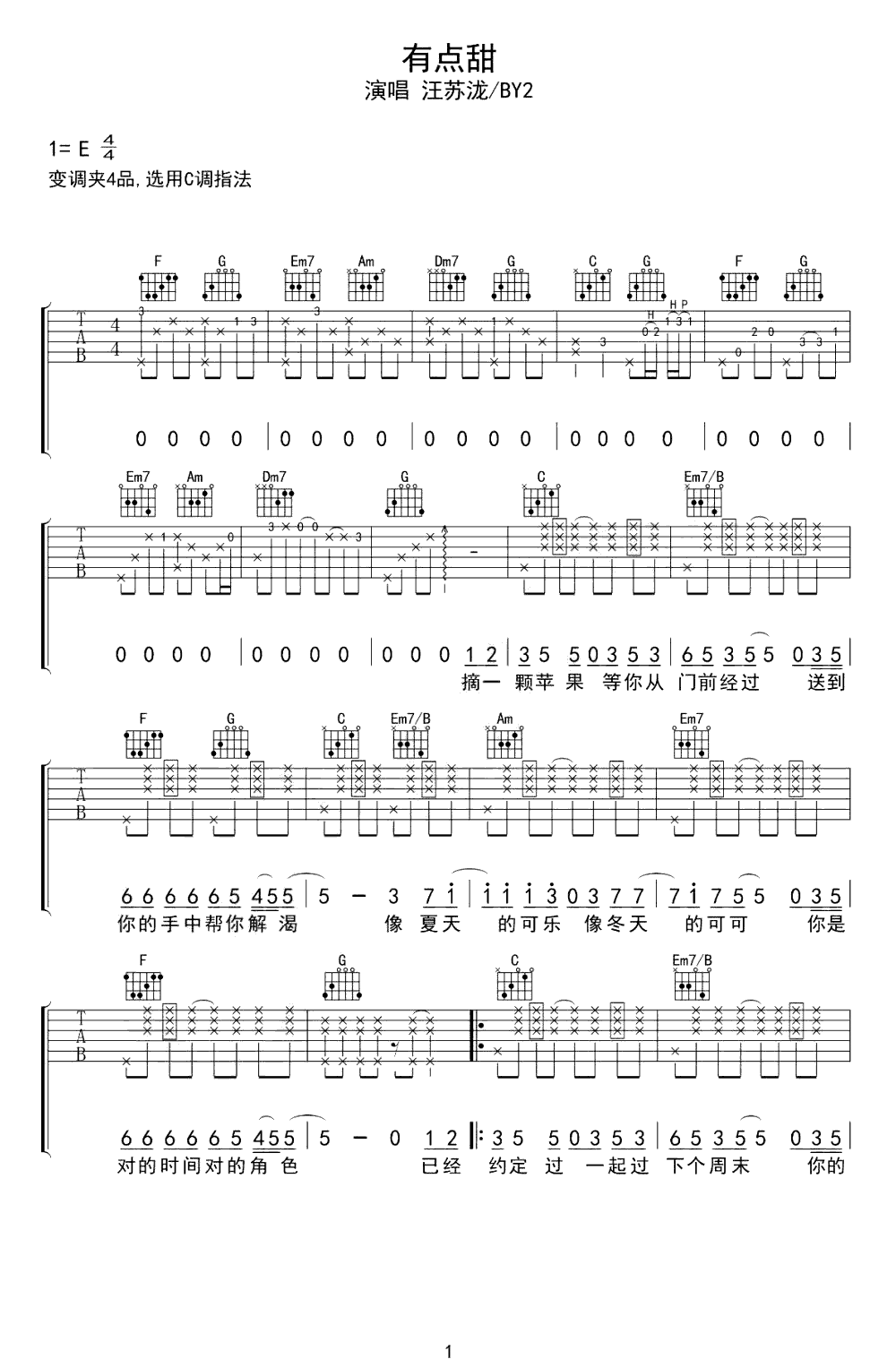 曲谱介绍: BY2/汪苏泷《有点甜》吉他谱【超原版编配】,共有3张高清六线谱图例,选用C调指法,变调夹推荐夹4品弹唱原调,节奏4/4品拍,主要用到了拍弦+扫弦滞音技巧,还原度效果较好,弹唱难度较简单。
