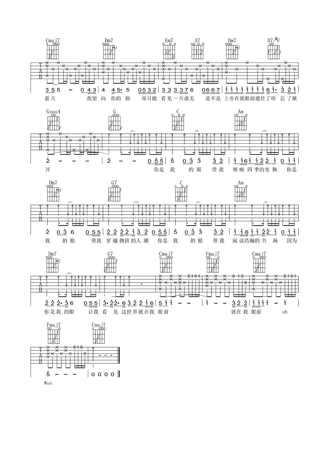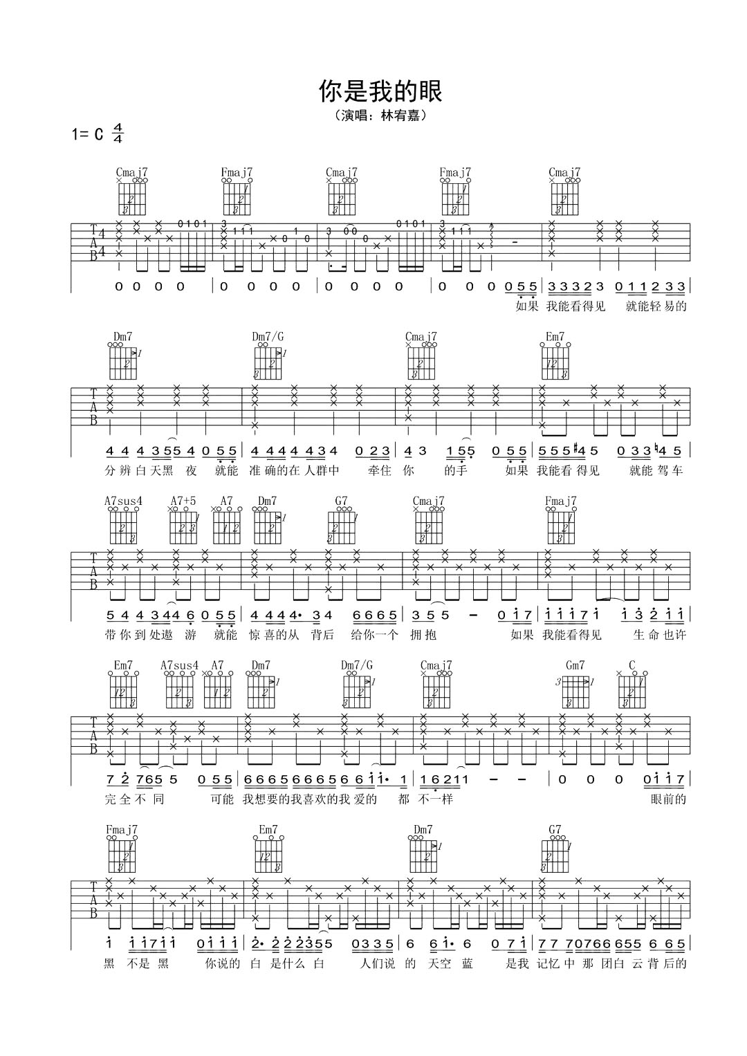 曲谱介绍: 林宥嘉《你是我的眼》吉他谱,总共2张高清图片谱,本谱为C调吉他弹唱谱,节奏4/4拍,包含完整前奏按原版编配,弹唱难度简单。