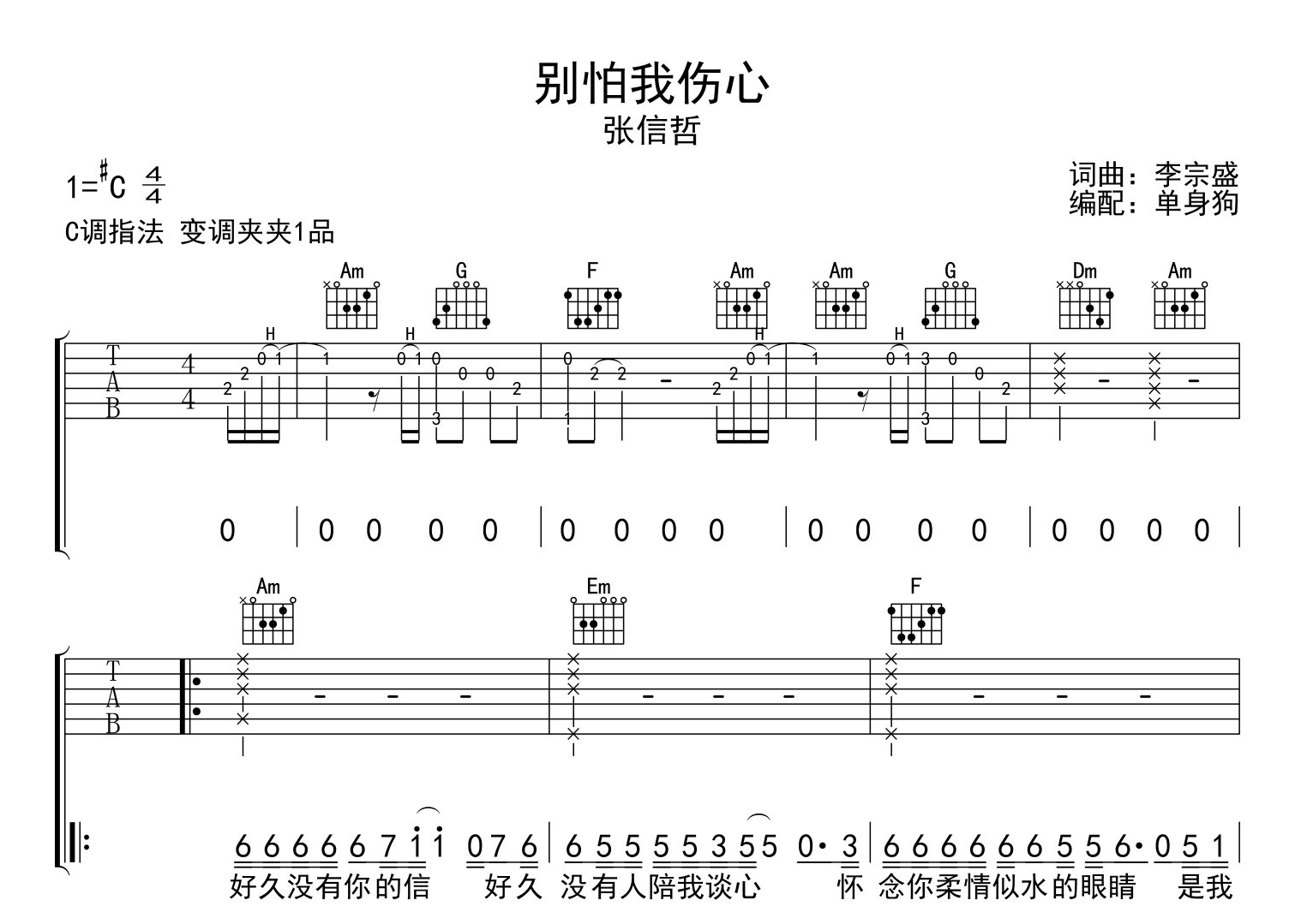 曲谱介绍: 由@单身狗制谱的《别怕我伤心》吉他谱,共有3张高清图片谱例,本谱为C调吉他弹唱谱,变调夹夹1品弹唱原调#C,包含完整的前奏按原版编配,难度较简单。