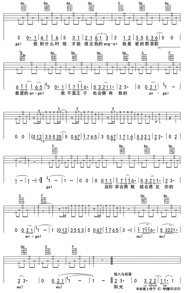 曲谱介绍: 《云中的angel》尤克里里谱,总共2张高清ukulele四线谱,原调为F调,节拍2/4拍,不使用变调夹,弹唱难度初级。