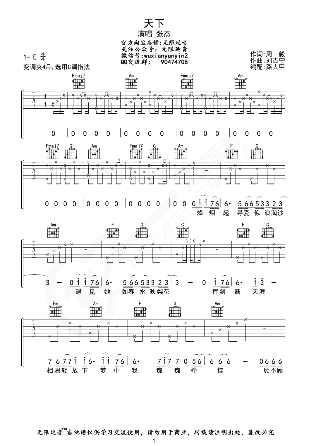 曲谱介绍: 张杰《天下》吉他谱,总共3张高清图片谱,原调为E调,选用E调指法,节拍4/4拍,不使用变调夹,弹唱难度初级。