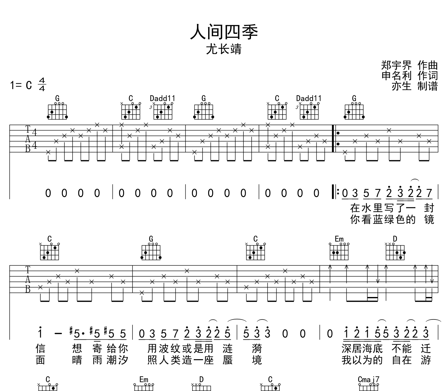 人间四季吉他谱 - 尤长靖 - C调吉他弹唱谱 - 原版