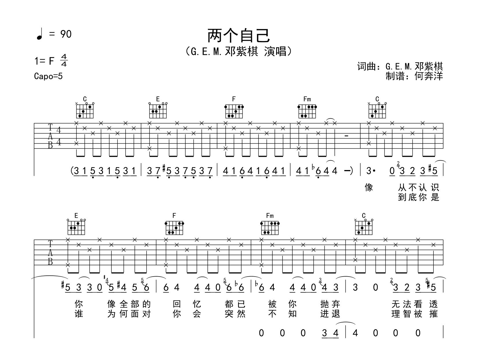 曲谱介绍: 邓紫棋《两个自己》吉他谱【附弹唱演示】,本谱由@何奔洋制谱,共2张高清图片谱例,选用C调指法编配,变调夹可夹5品弹唱原调,节奏4/4拍,速度90拍,原版编配含完整前奏,弹唱难度较简单。 吉他弹唱预览音频: