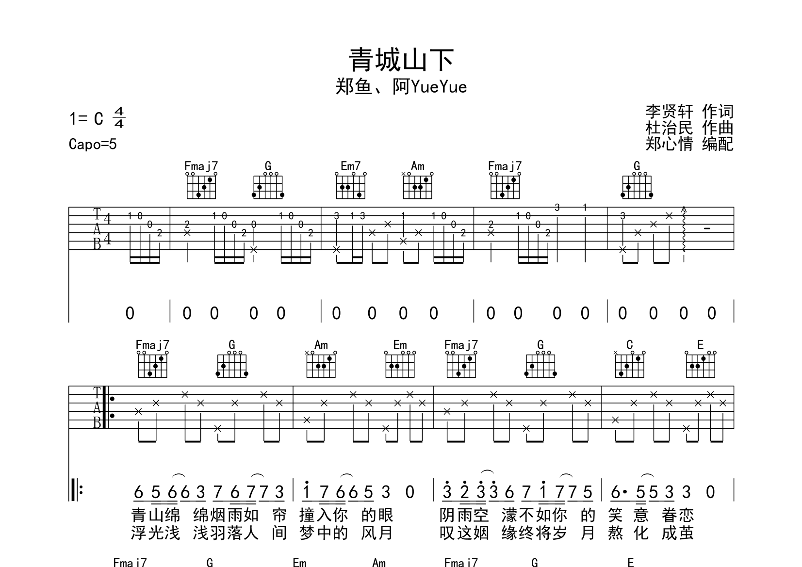 青城山下吉他谱 - 郑鱼,阿yueyue - C调吉他弹唱谱