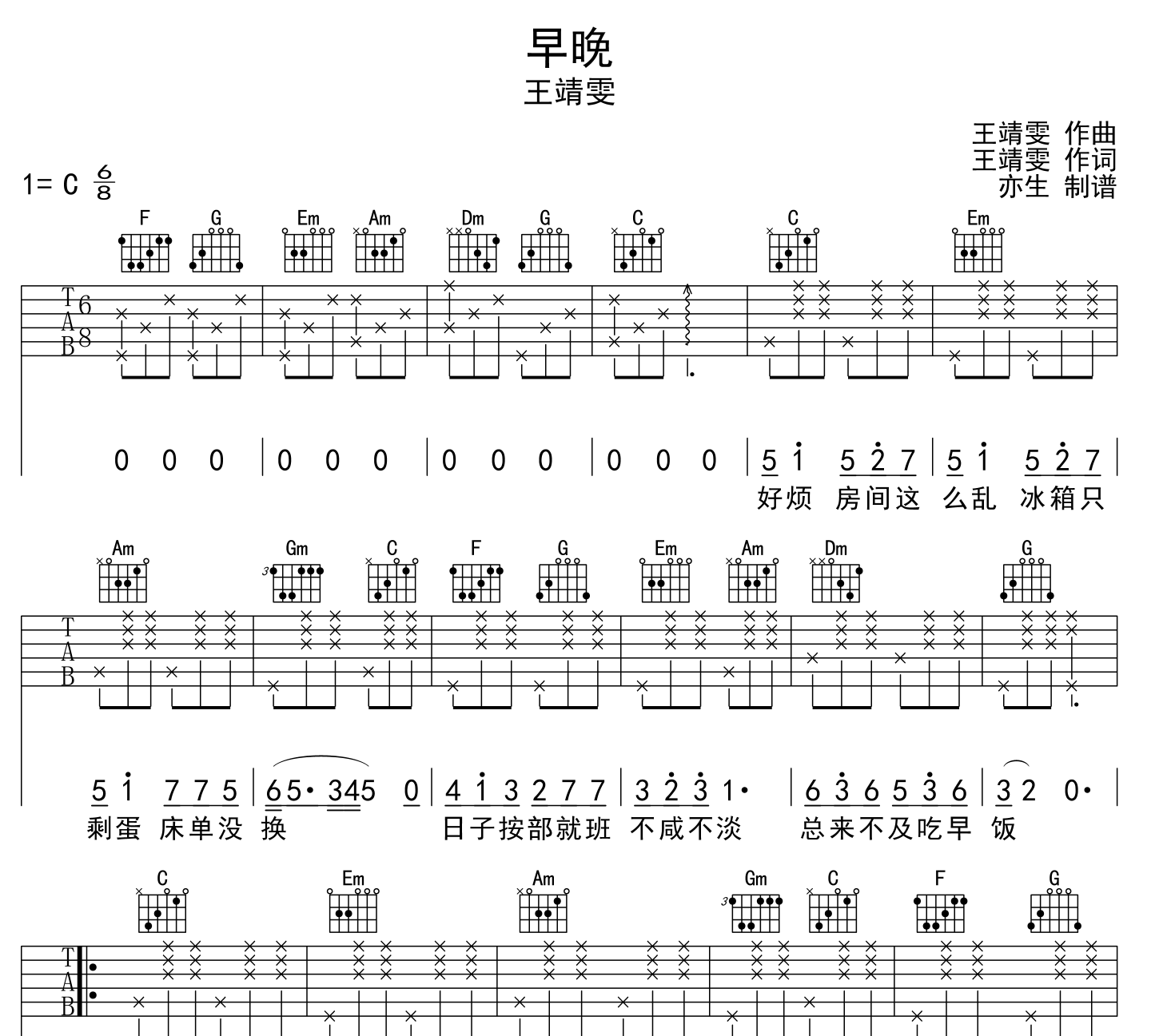 曲谱介绍: 王靖雯《早晚》吉他谱,由创作者亦生制谱,共有2张高清六线谱图例,本谱采用C调和弦指法编配,节奏为6/8拍,速度为95拍每分钟,弹唱建议变调夹夹4品,难度较简单。