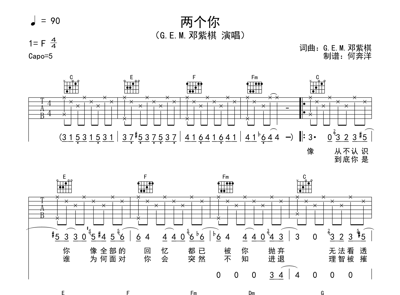 曲谱介绍: 由创作者何奔洋制谱的《两个你》吉他谱,共有2张高清无缝翻页图片谱例,选用C调指法编配,节奏4/4拍,速度90BPM,变调夹夹5品处弹唱,难度较简单。 吉他弹唱预览音频: