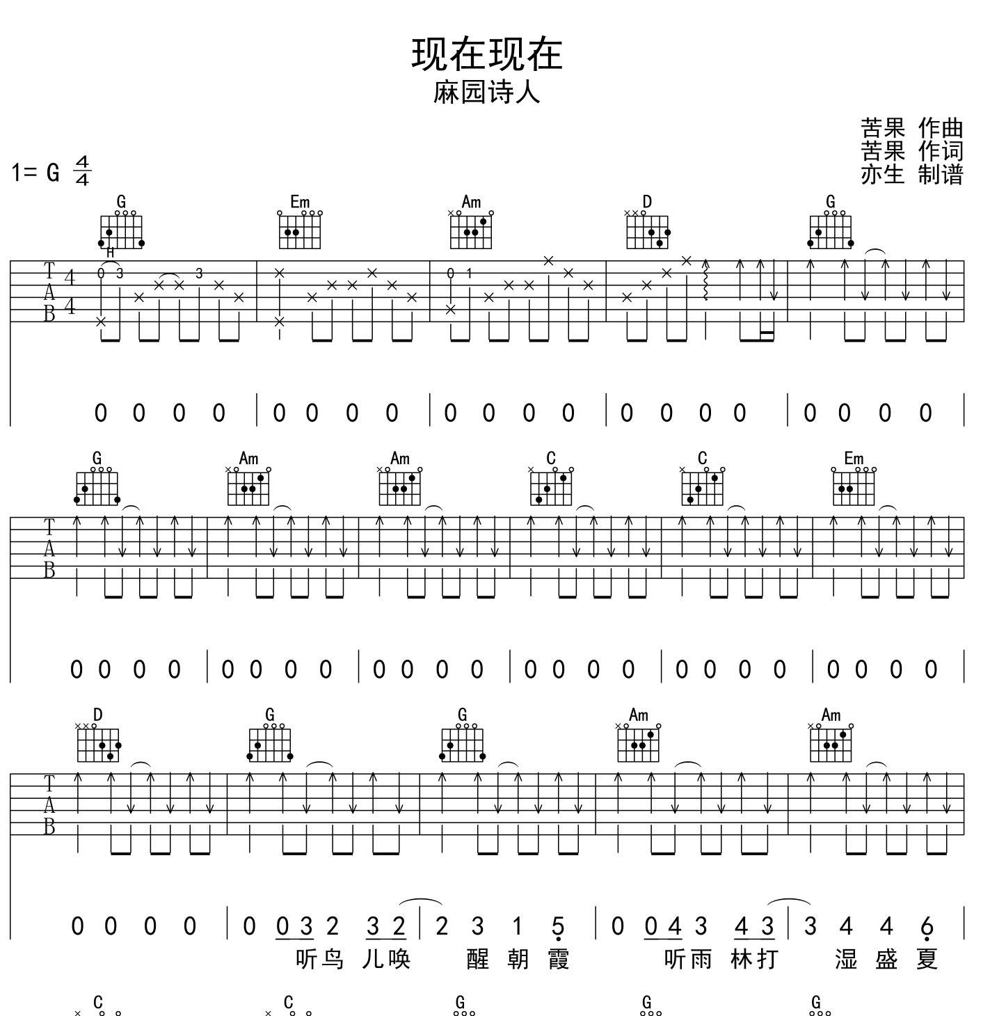 曲谱介绍: 麻园诗人《现在现在》吉他谱,本谱采用G调和弦指法编配,节奏为4/4拍,速度为100拍每分钟,弹唱建议变调夹不夹,难度简单