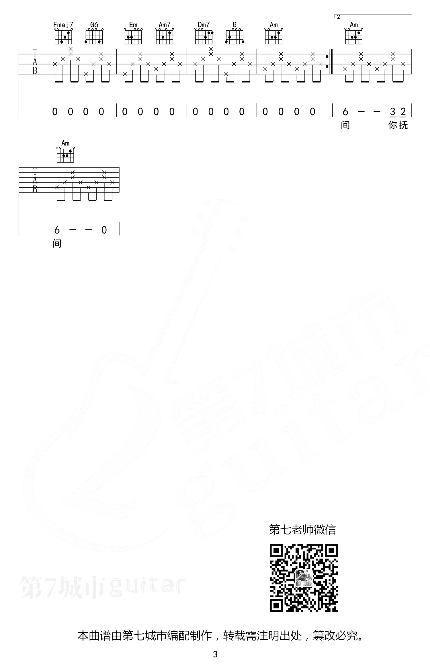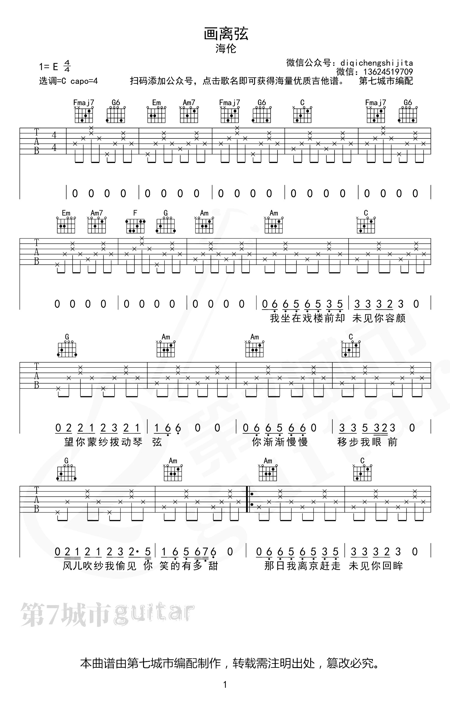 曲谱介绍: 海伦《画离弦》吉他谱,由第7城市编配制谱,共有3张高清图片谱例,本谱为C调吉他弹唱谱,变调夹夹4品弹唱原调E调,难度较简单。