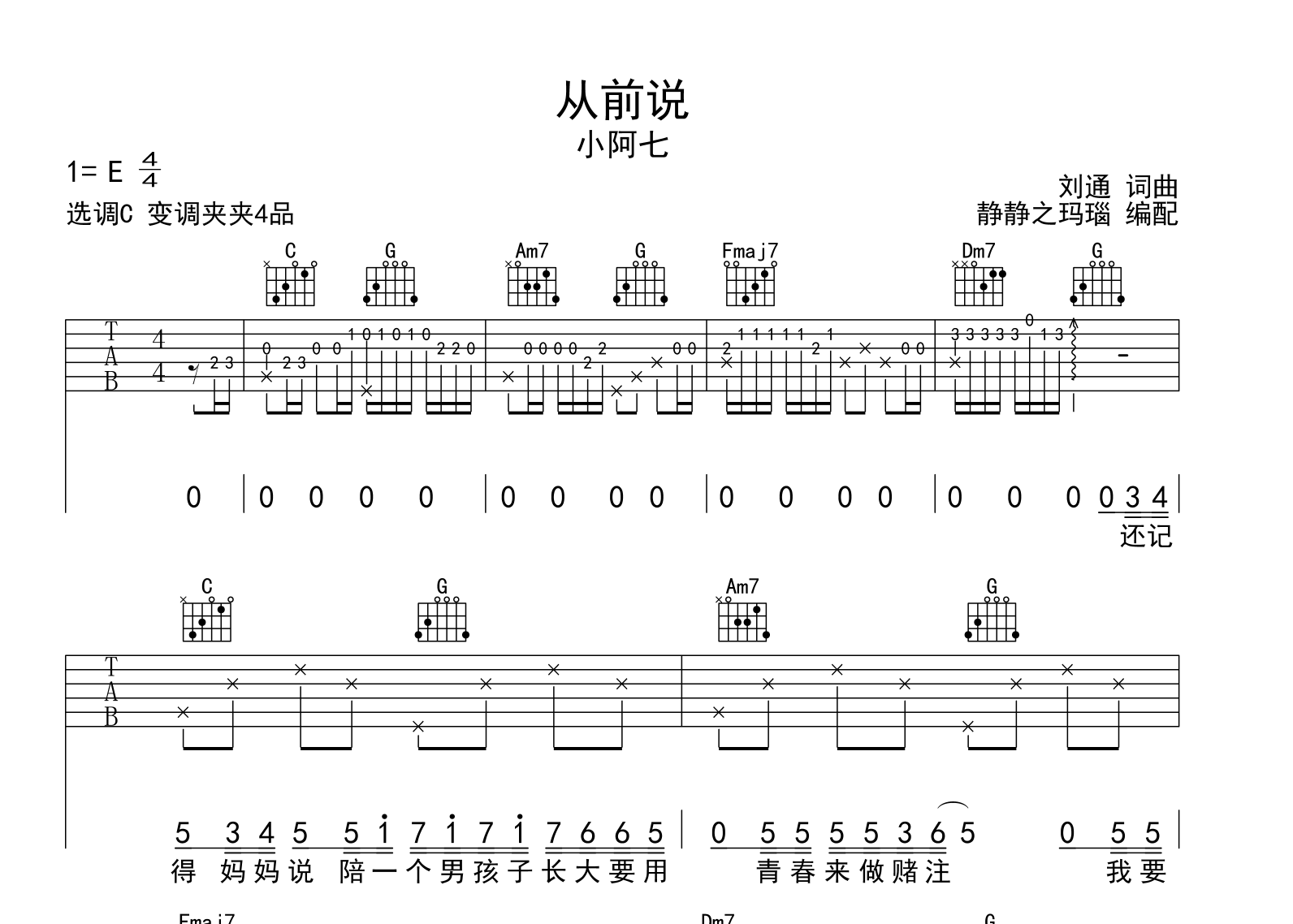 曲谱介绍: 小阿七《从前说》吉他谱,由创作者@静静之玛瑙制谱,共4张高清六线谱图例,本谱采用C调和弦指法编配,节奏为4/4拍,速度为80拍每分钟,弹唱建议变调夹夹4品,也可以根据个人嗓音找到一个舒服的位置